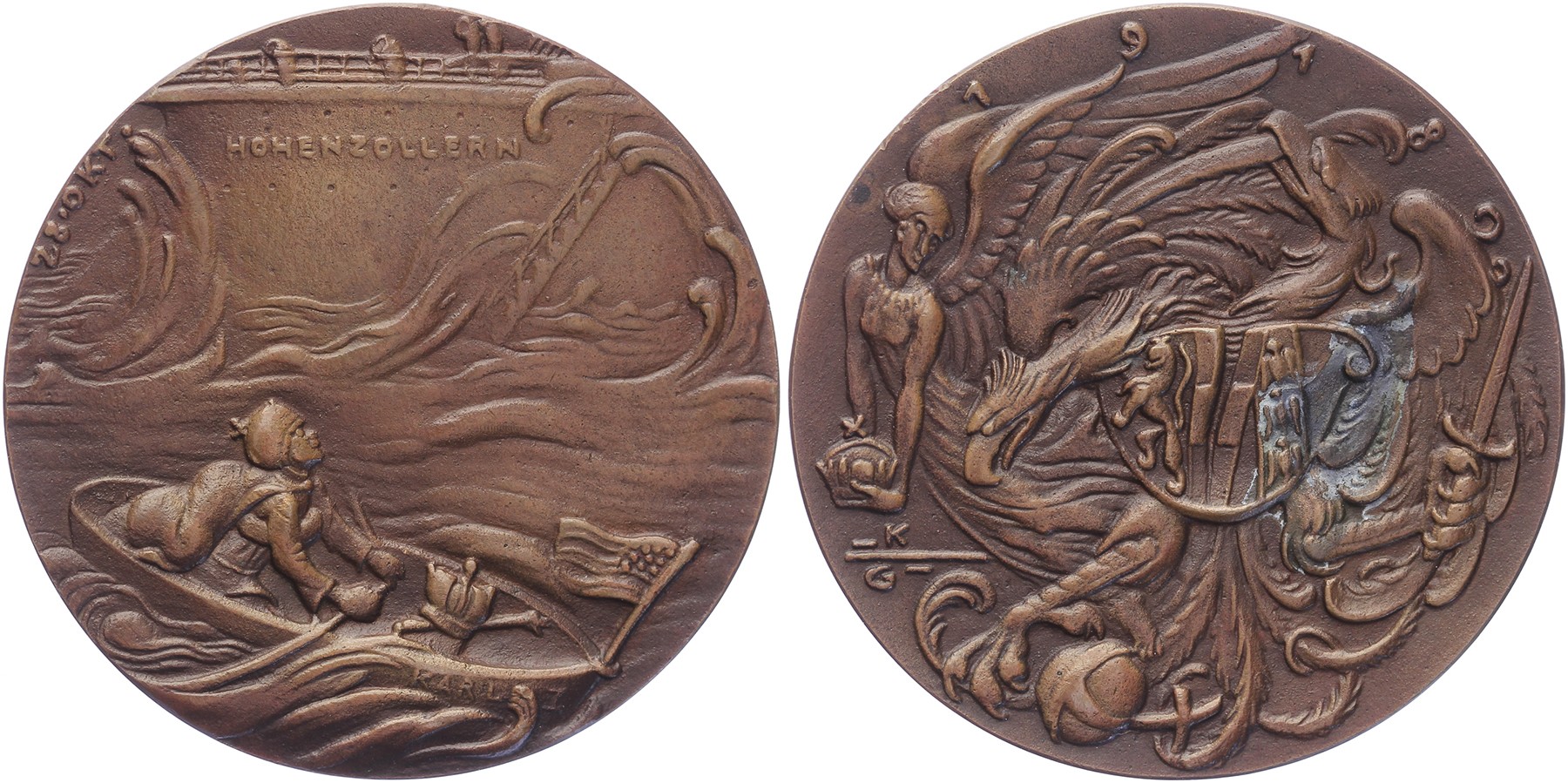 1918 Österreichs Verfall. Karl I. verlässt das Schiff Hohenzollern mit Krone und Zepter unter amerikanischer Flagge. / Österreichisches-Ungarisches Schild zerstört.Æ gegossen 58,2. Kienast 212. Große Silver (?) fleck Rückseite. Vorzüglich.