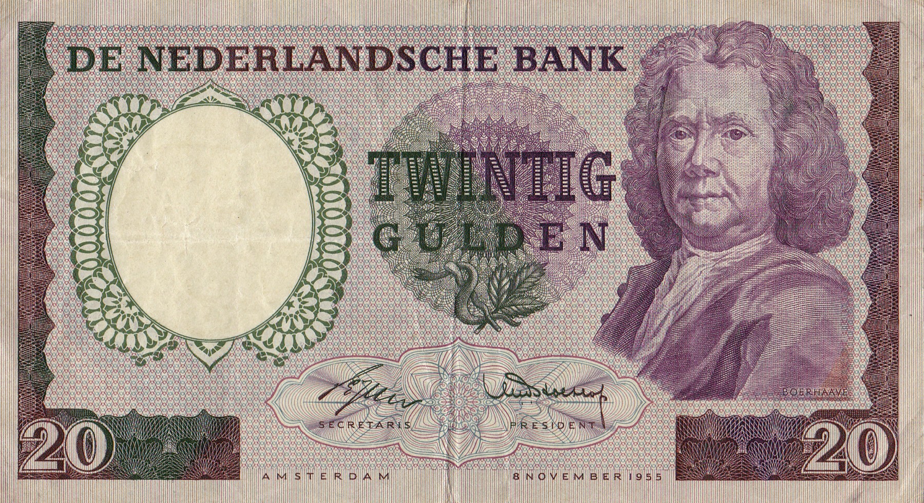 20 Gulden 1955 Boerhaave. Mev. 60-1; PL 53.a [# 1 AE 037394]. Zeer fraai.
