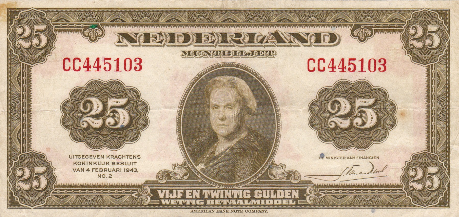 25 Gulden 1943-II ABNC. Mev. 79-1; PL 64 [# CC 445103]. Zeer fraai.