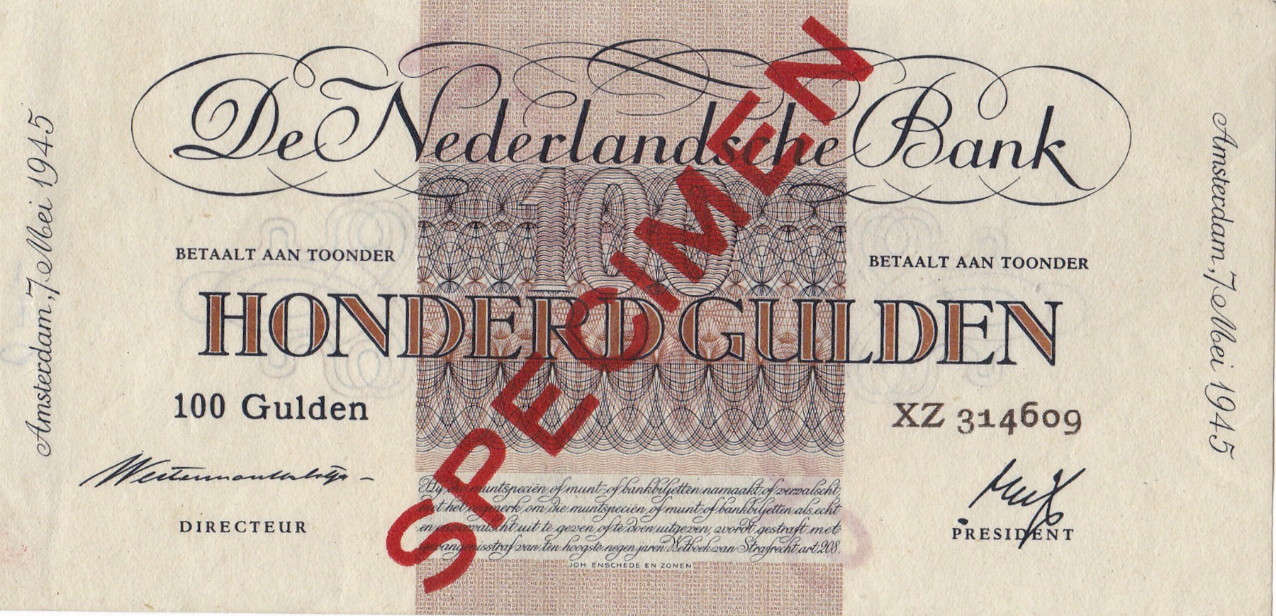 100 Gulden 1945 Geldzuivering, specimen. Vgl. Mev. 119-1a; PL 99.s1 [# XZ 314609].Kz. inktnotitie “o - -“. Vrijwel UNC.