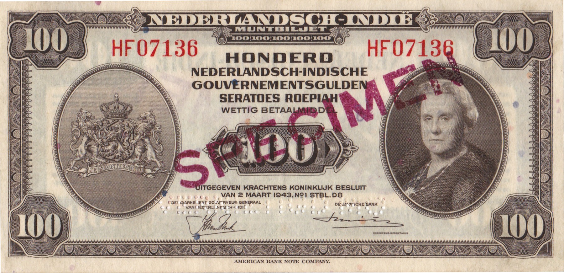 100 Gulden 1943 Muntbiljet Wilhelmina. Specimen + perforatie “VERNIETIGD MO”.Pick 117s; PL NI-28.8s1 [# HF 07136]. Bijna UNC.