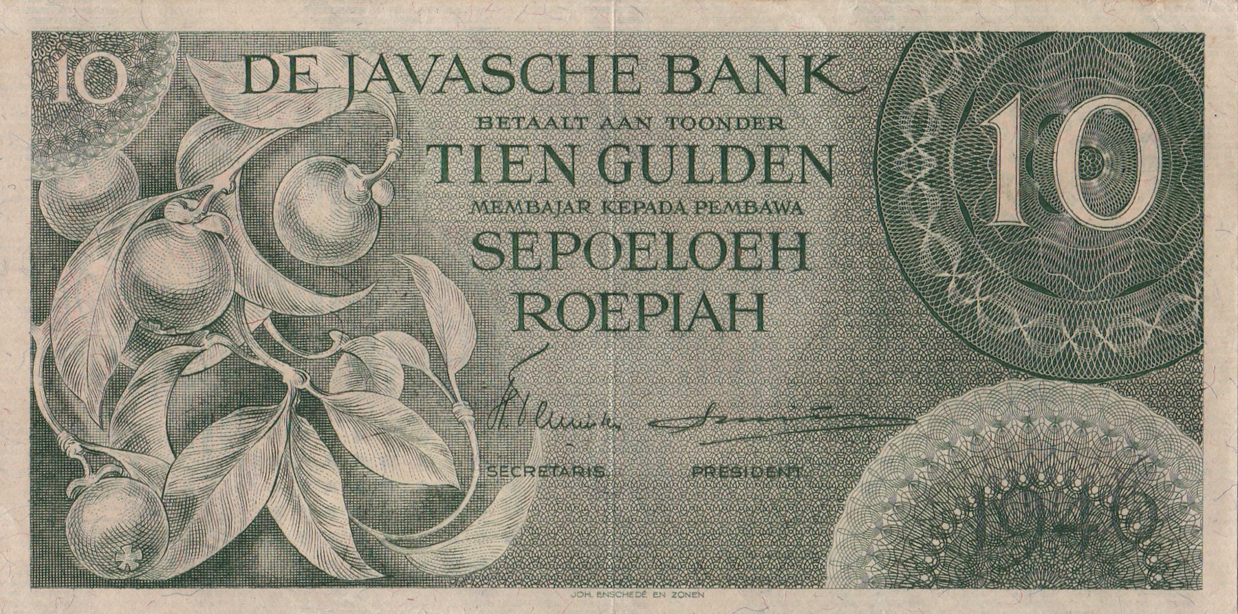 10 Gulden 1946 Mango, groen. Pick 89; PL NI-29.2a [# KU 074849]. Prachtig.