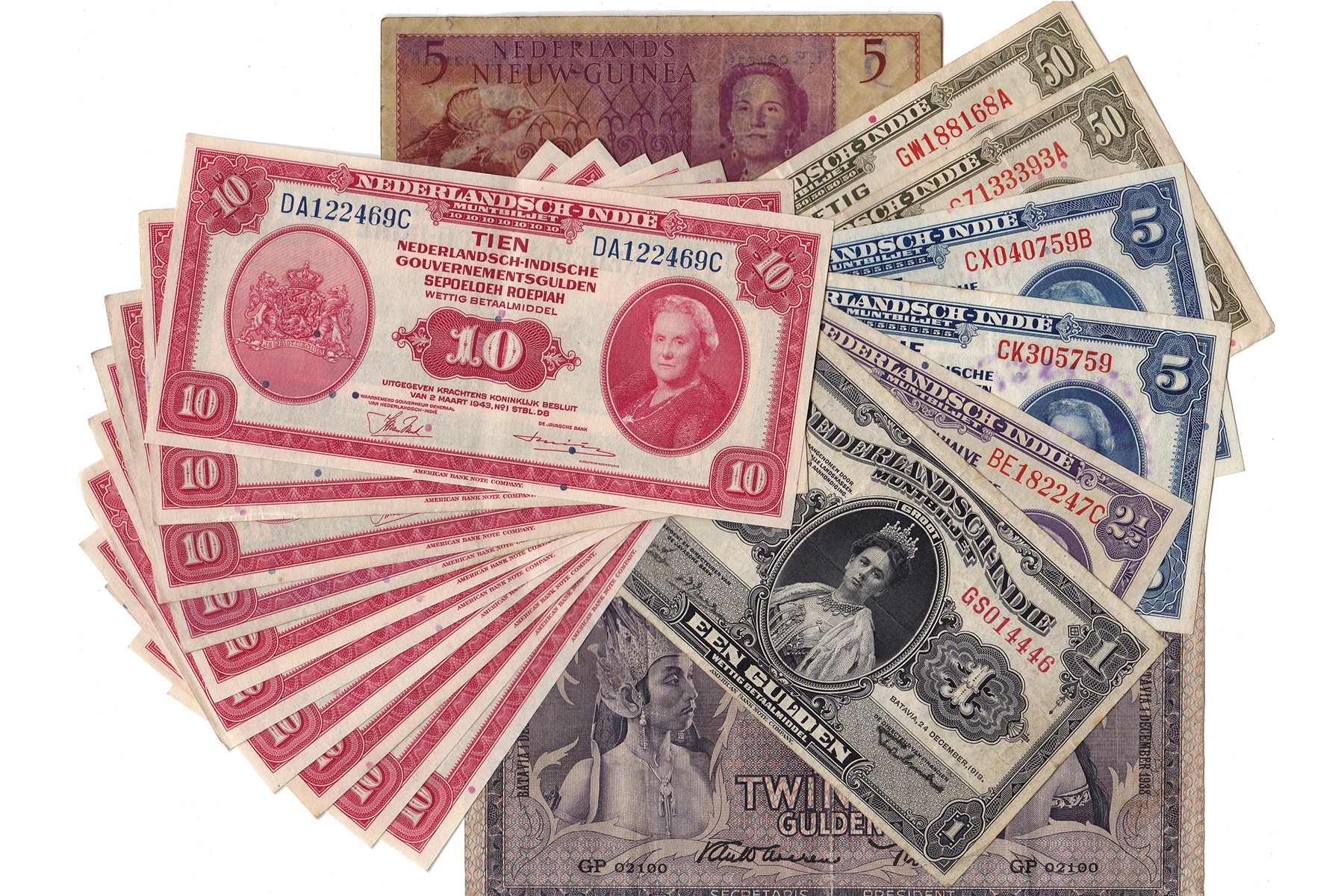 Lot (18) met o.a. 1 Gulden 1919, 2 ½ Gulden 1943, 5 Gulden 1943, 10 Gulden 1943 (10), 50 Gulden 1943 (2), Javaasche Bank 25 Gulden 1938, Nieuw-Guinea 5 Gulden 1943 met stempel en 5 Gulden 1954. Fraai en beter.