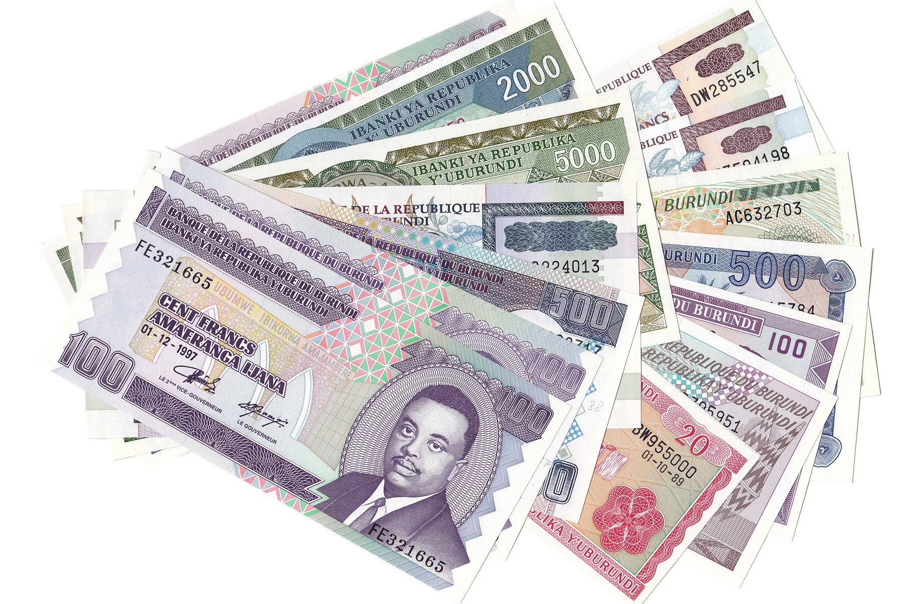 Lot (14) met verschillende denominaties Burundi o.a. diverse complete series 20 Francs t/m 1000 Francs 1975-1978 issues en 50 Francs t/m 5000 Francs 1993-1997 issues. Pick 27 t/m 31, 36 t/m 41, 44. Almost UNC.