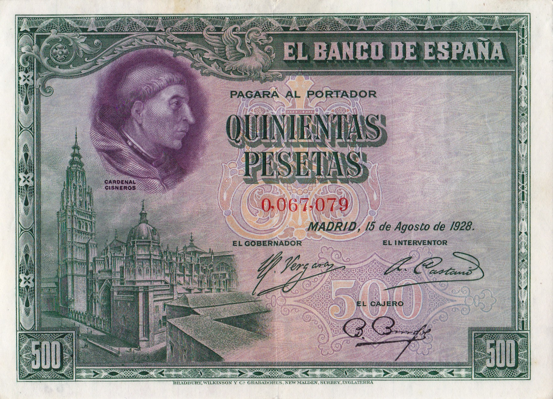 500 Pesetas 15-8-1928. Pick 77a [# 0,067,079]. VF.