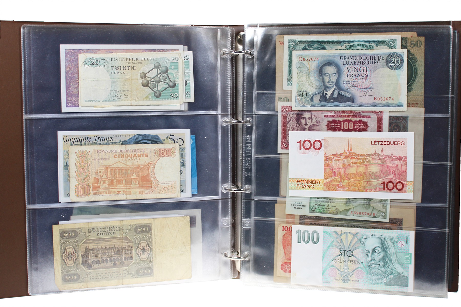 Bruin album met eenvoudig gebruikt bankbiljettenspul, ca. 40 stuks!