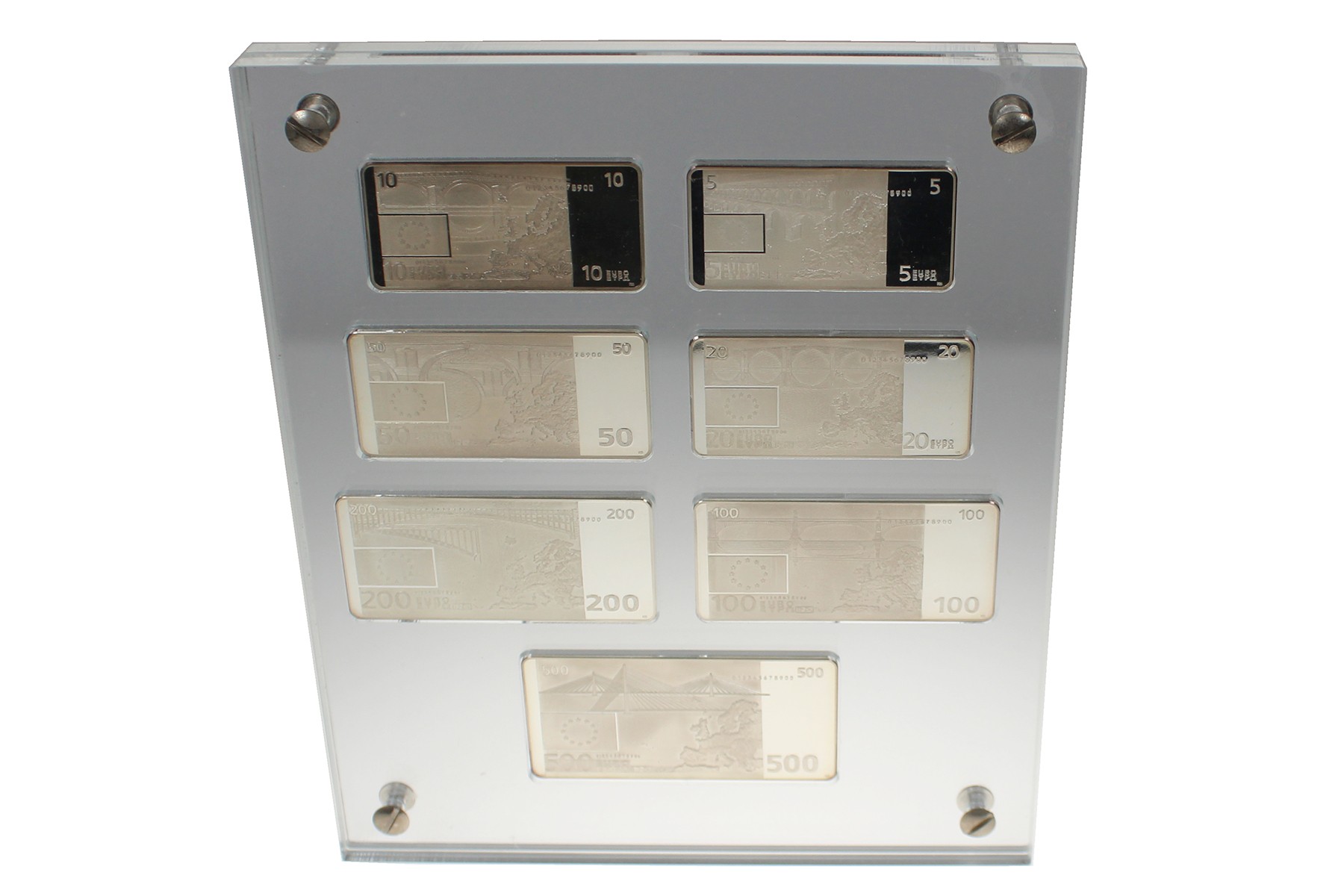 5 t/m 500 Euro gemaakt op sterling zilveren plaatjes in transparante kunststof presentatiestandaard.