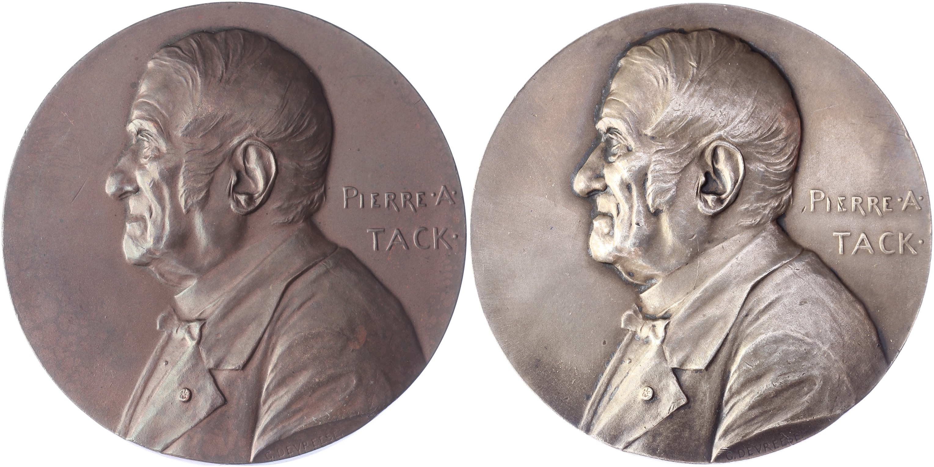 Lot (2) 1904 Ter ere van Pierre Amand Tack, minister van Staat. Buste naar links. / Zevenregelig opschrift. AR [108,59 gr.] + Æ 65. Willenz 30; PVD 35. Prachtig.