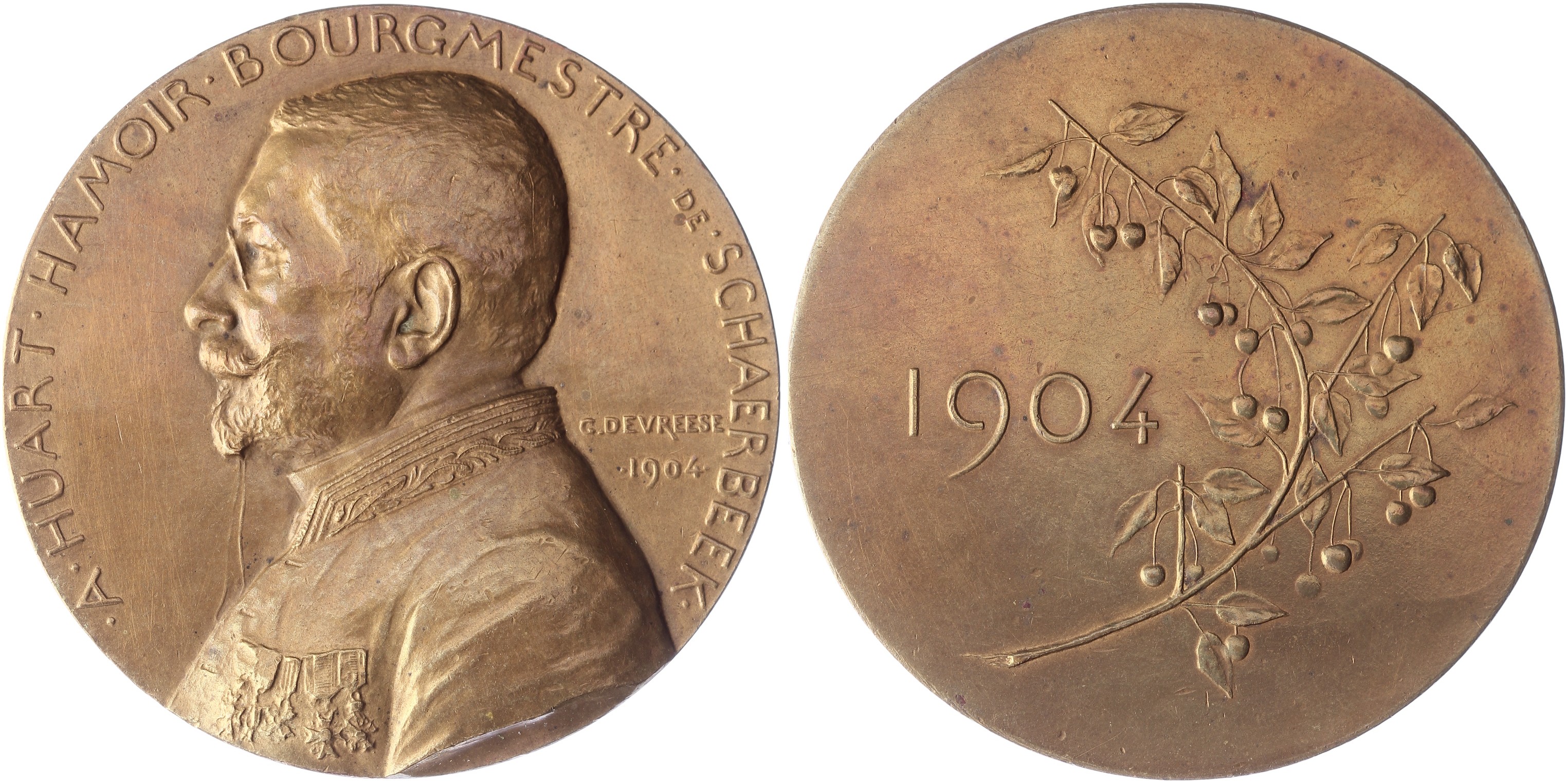 1904 Achille Huart Hamoir, burgemeester van Schaerbeek. Buste in uniform naar links. / Jaartal naast kersentak. Æ 65,4. Willenz 43; PVD 43. Schaars. Prachtig.