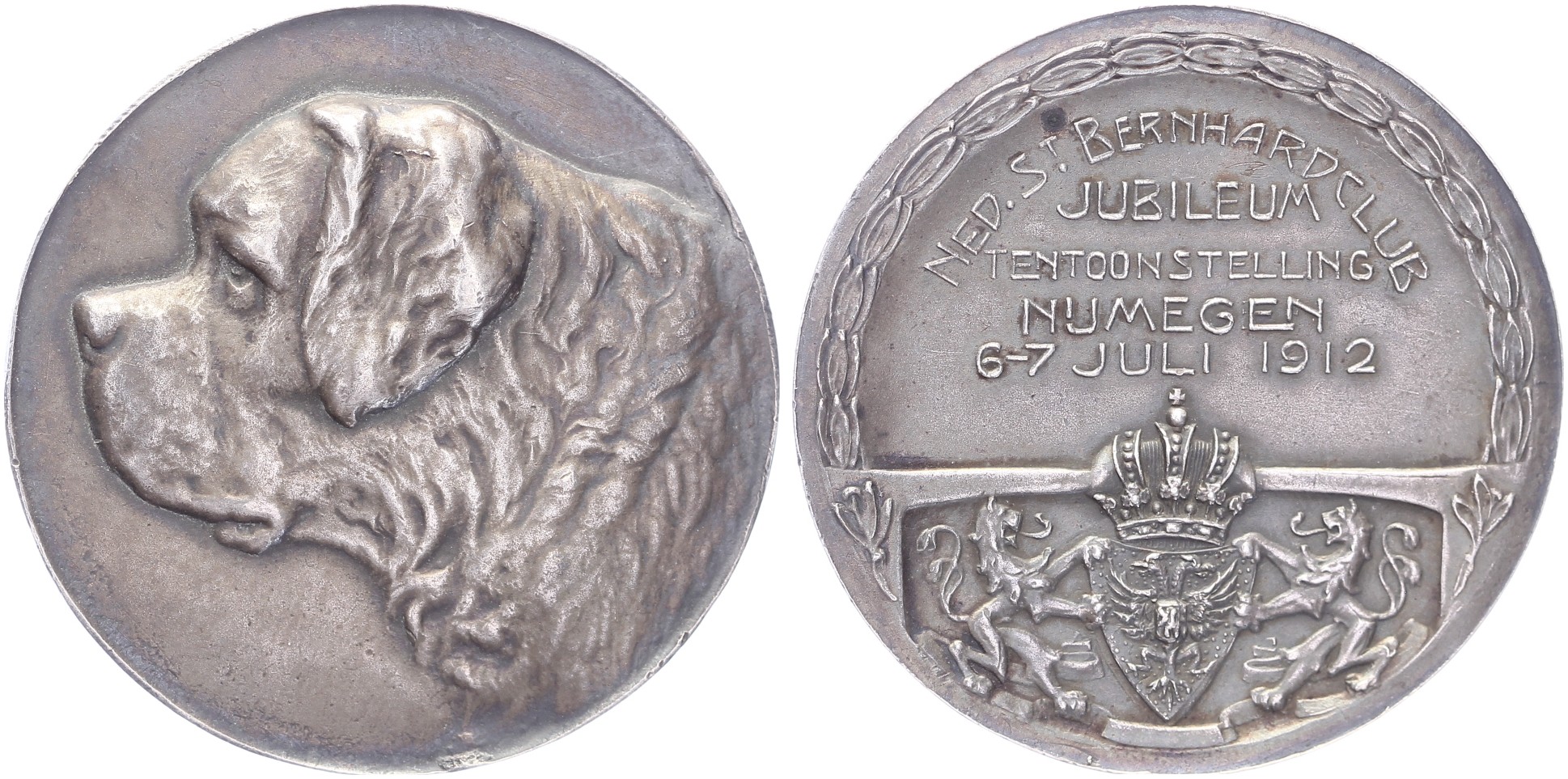 1912 Nijmegen, jubileumtentoonstelling Ned. St. Bernard Club. Kop St. Bernard naar links. / Op- en omschrift boven wapen van Nijmegen. AR [19,59 gr.] 40,6. Vgl. Matzen 374; PVD pag. 195. Prachtig.