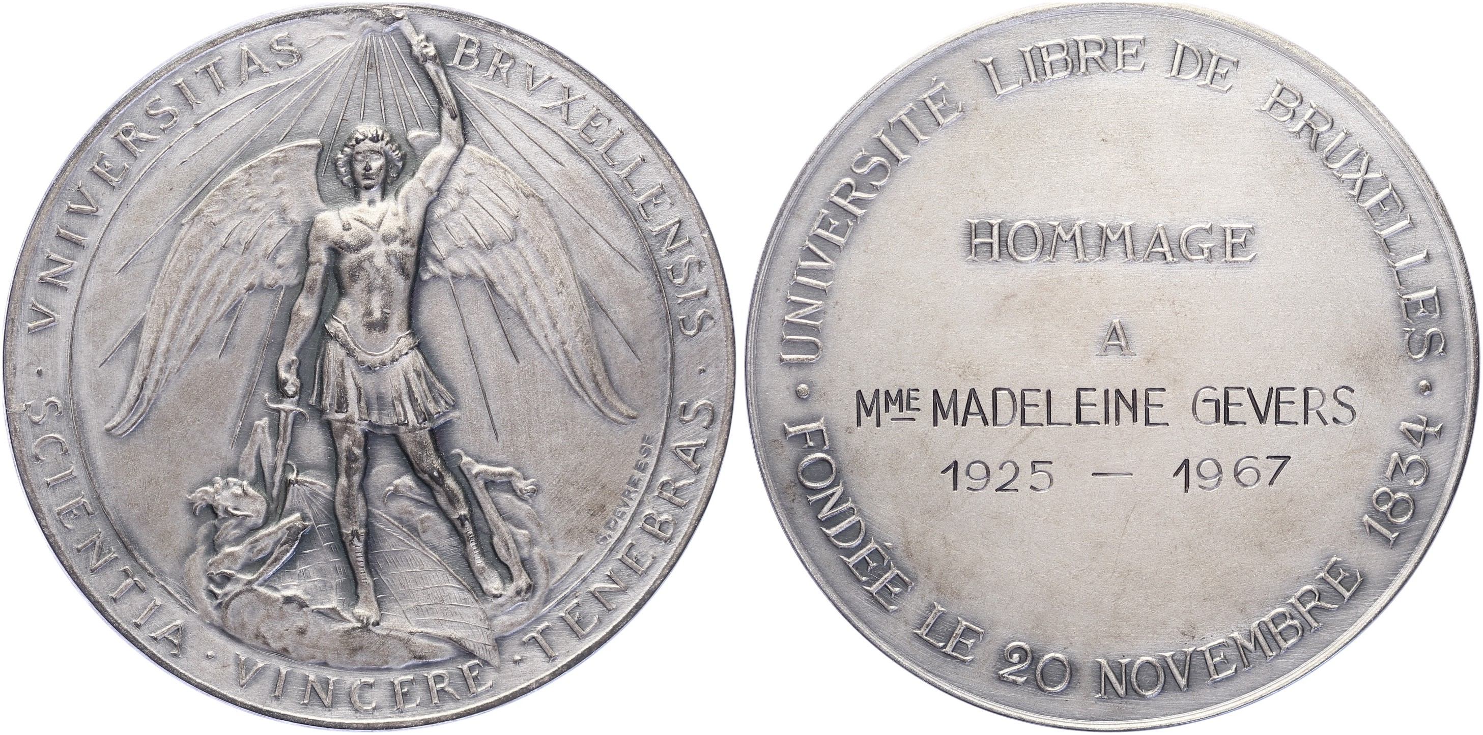 1909 Brussel, 75 jaar Vrije Universiteit. St. Michaël verslaat de duivel. / Inscriptieruimte onder “HOMMAGE A”. O.n.v. Edgard Alen. Æ 65,2. Willenz 89; PVD 98. Gelakt. Prachtig.
