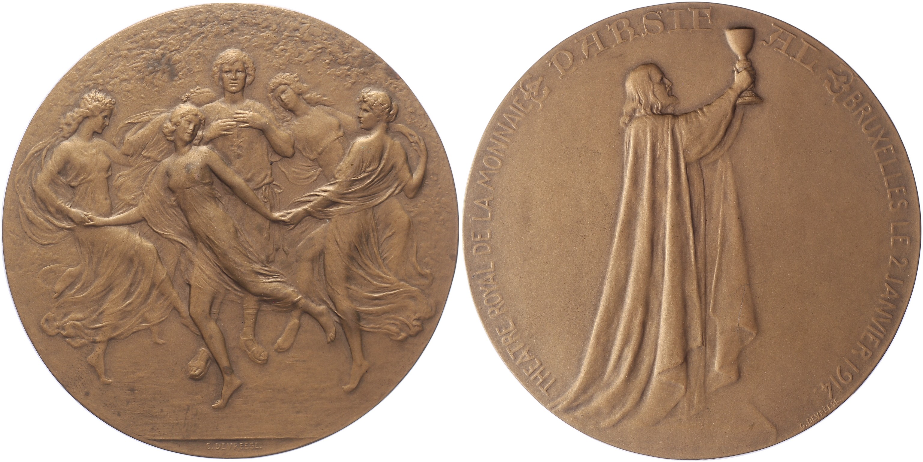 1914 Parsifal. Vijf meisjes dansen rondom staande vrouw. / Staande Parsifal met hooggeheven beker. Æ 75,7. Willenz 48; PVD 160. Prachtig.
