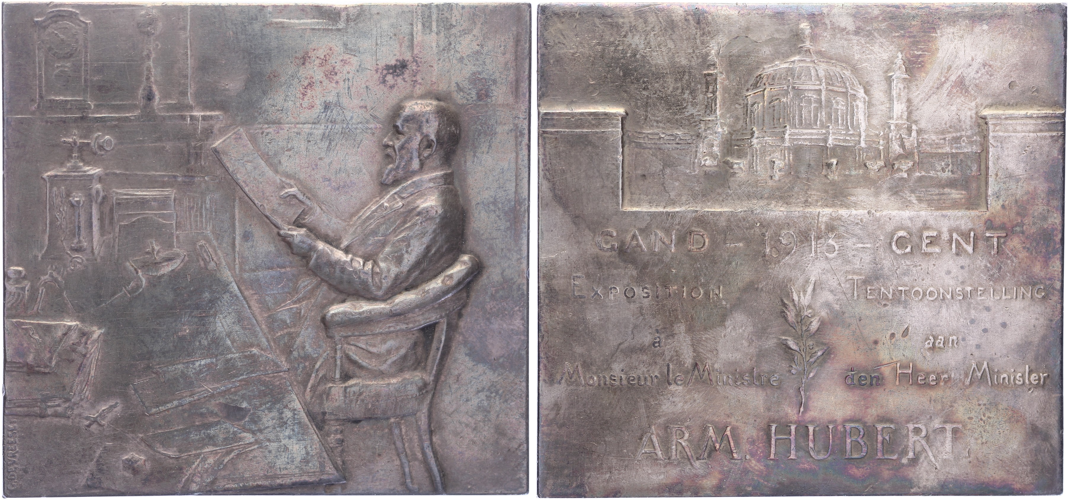 1913 Gent. Ter ere van minister Armand Hubert. Aan bureau zittende Hubert. / Tentoonstellings-paleis + tekst. AR [123,28 gr.] 61,8 x 65,8. In originele doos. Willenz 150; PVD 162. Zeer fraai.