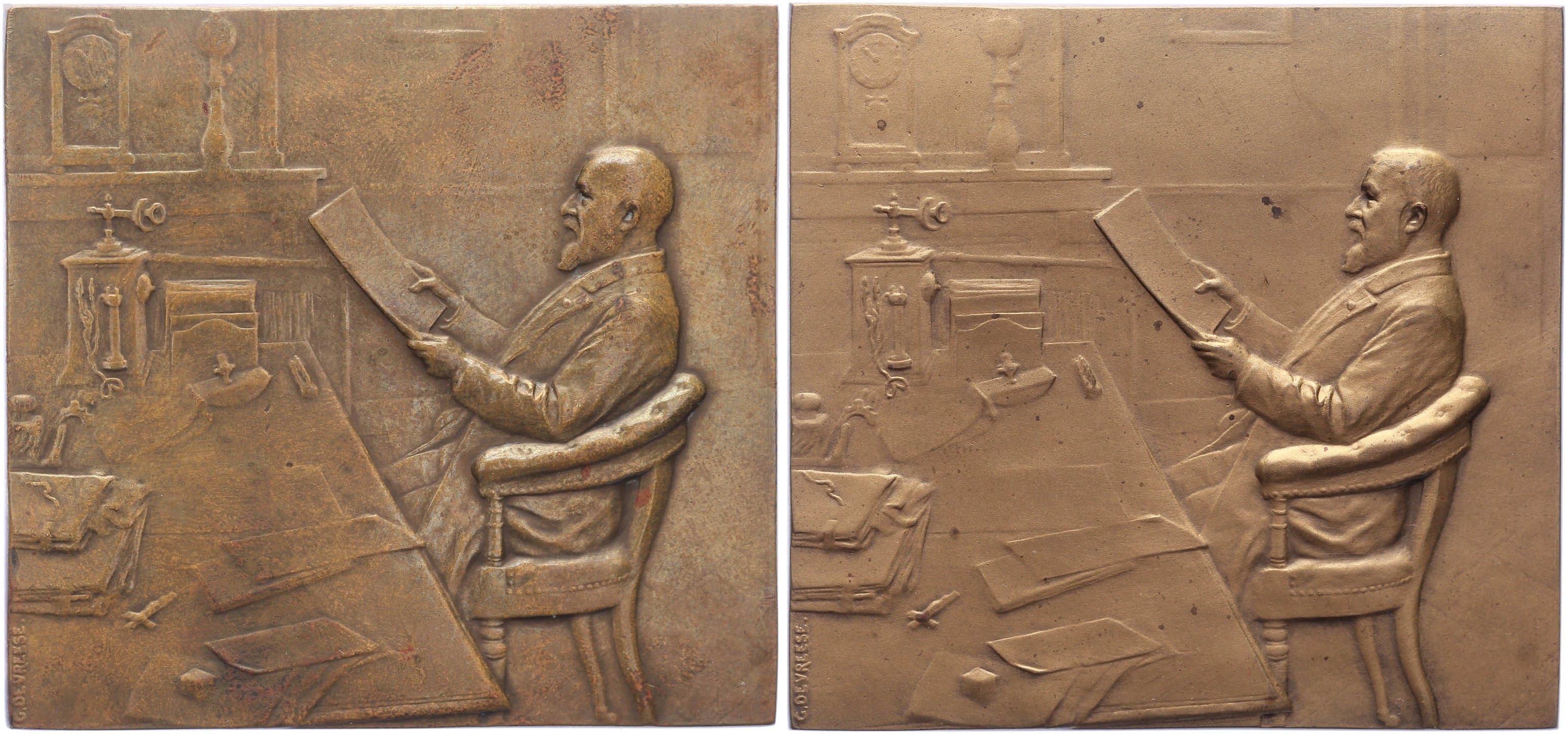 Lot (2) 1913 Gent. Ter ere van minister Armand Hubert. Aan bureau zittende Hubert. / Tentoonstellingspaleis + tekst. Æ 61,8 x 65,8. Willenz 150; PVD 162. Zeer fraai.