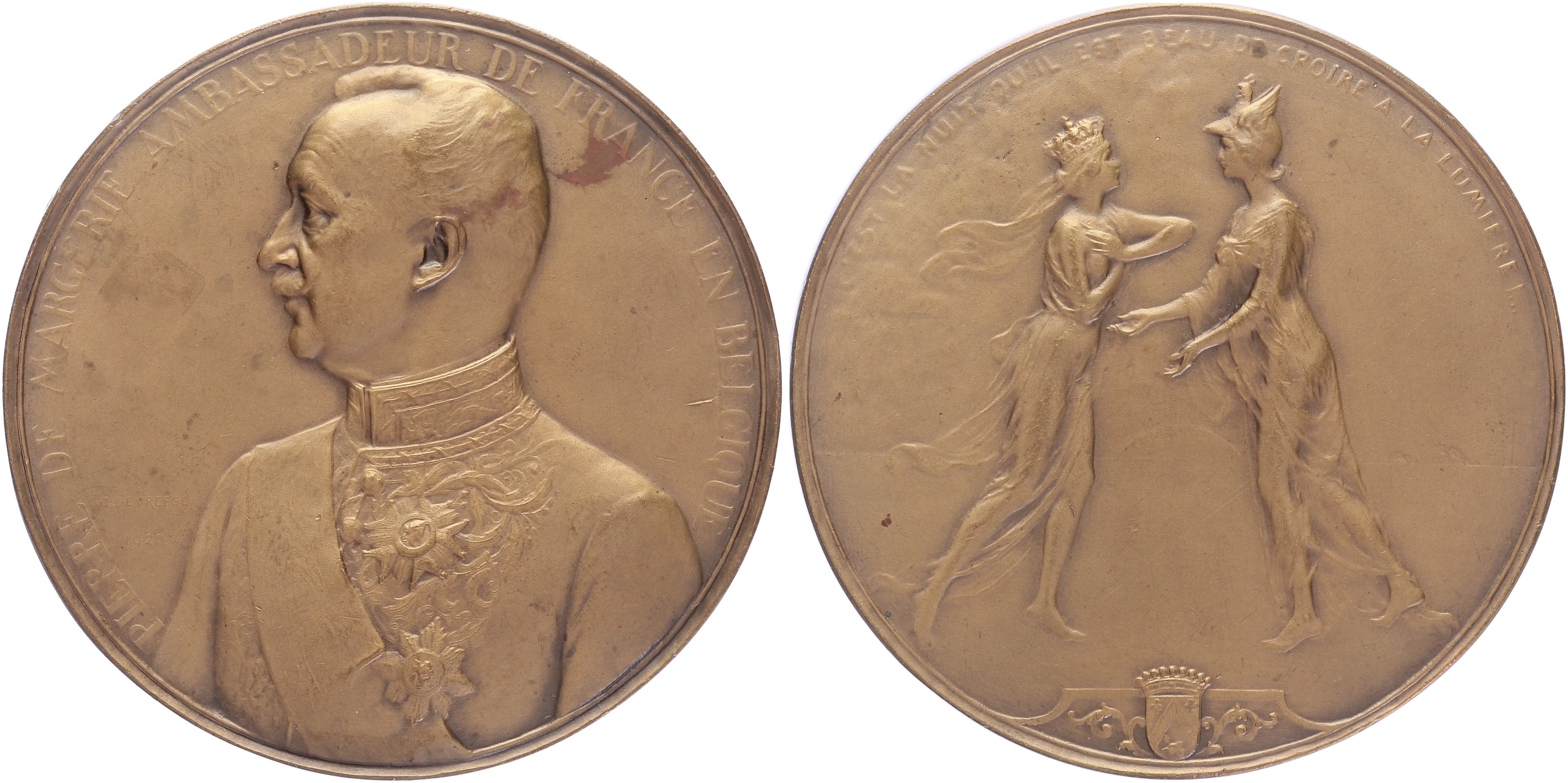 (1920) Pierre de Margerie, ambassadeur Frankrijk & België. Buste naar links. / Allegorische Frankrijk en België geven elkaar de hand. Æ 75. Willenz 227; PVD 244. Vlek vz. Prachtig.