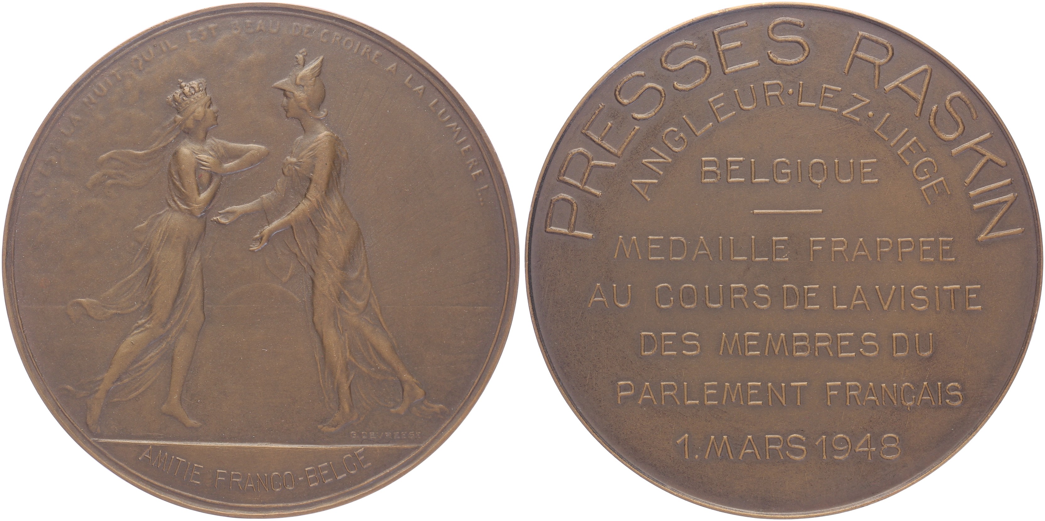 (1920)/1948. Presses Raskin. Allegorische Frankrijk en België geven elkaar de hand. / Op- en omschrift. Æ 75. Willenz 227; PVD 244. Prachtig.
