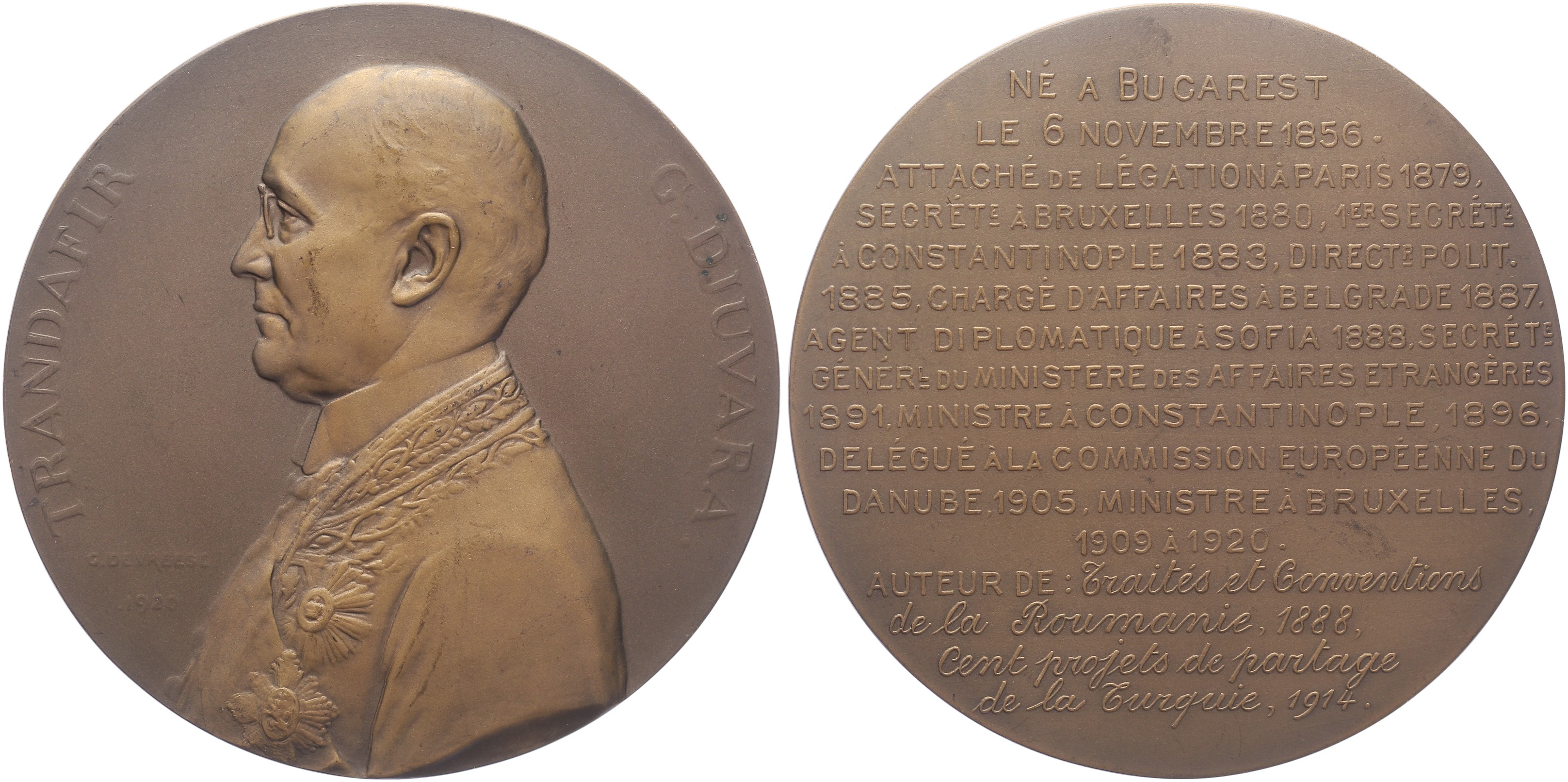 1920 Ter ere van Trandafir G. Djuvara, politicus. Bust in gala-uniform van de Roemeense minister naar links. / Zestienregelig opschrift. Æ 74,8. Willenz 229; PVD 246. Prachtig.