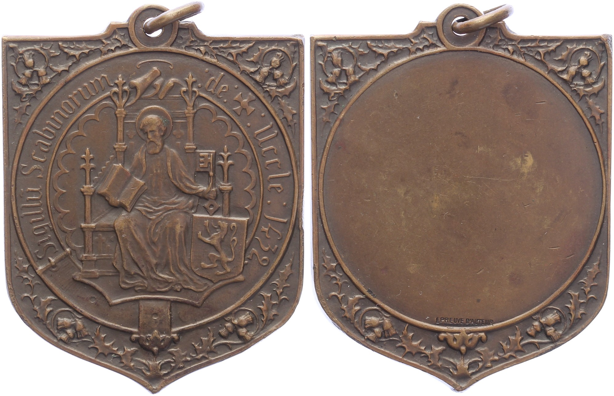 (1920) Wapenschild Ukkel. Tronende Sint-Pieter. / Inscriptieruimte. Bronzen plaquette in de vorm van een wapenschild 60 x 46. Willenz 231; PVD 248. Prachtig.