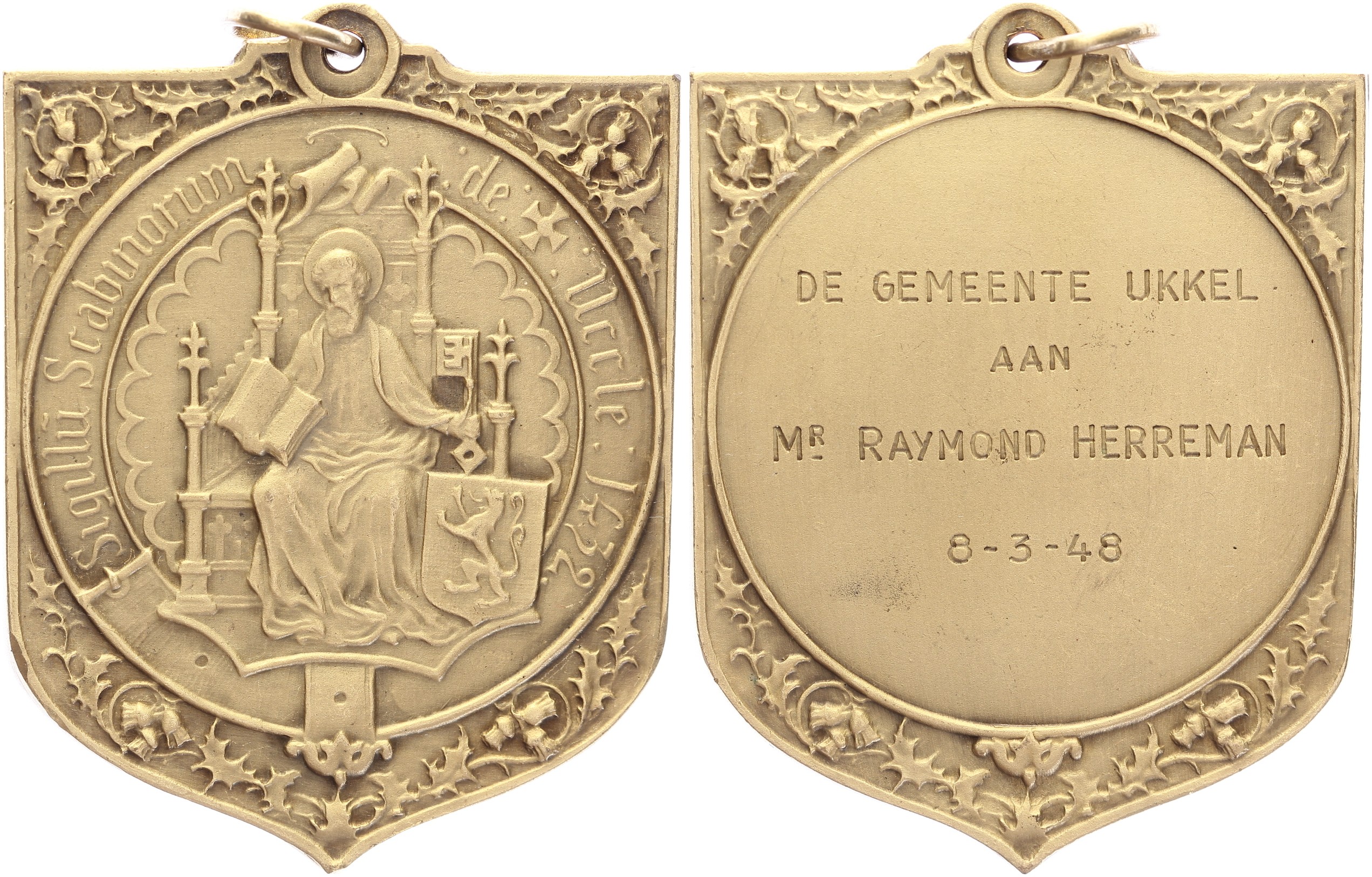(1920)/1948 Wapenschild Ukkel. Tronende Sint-Pieter. / Vierregelig opschrift. Messing plaquette in de vorm van een wapenschild 60 x 46. In origineel doosje. Willenz 231; PVD 248. Prachtig.