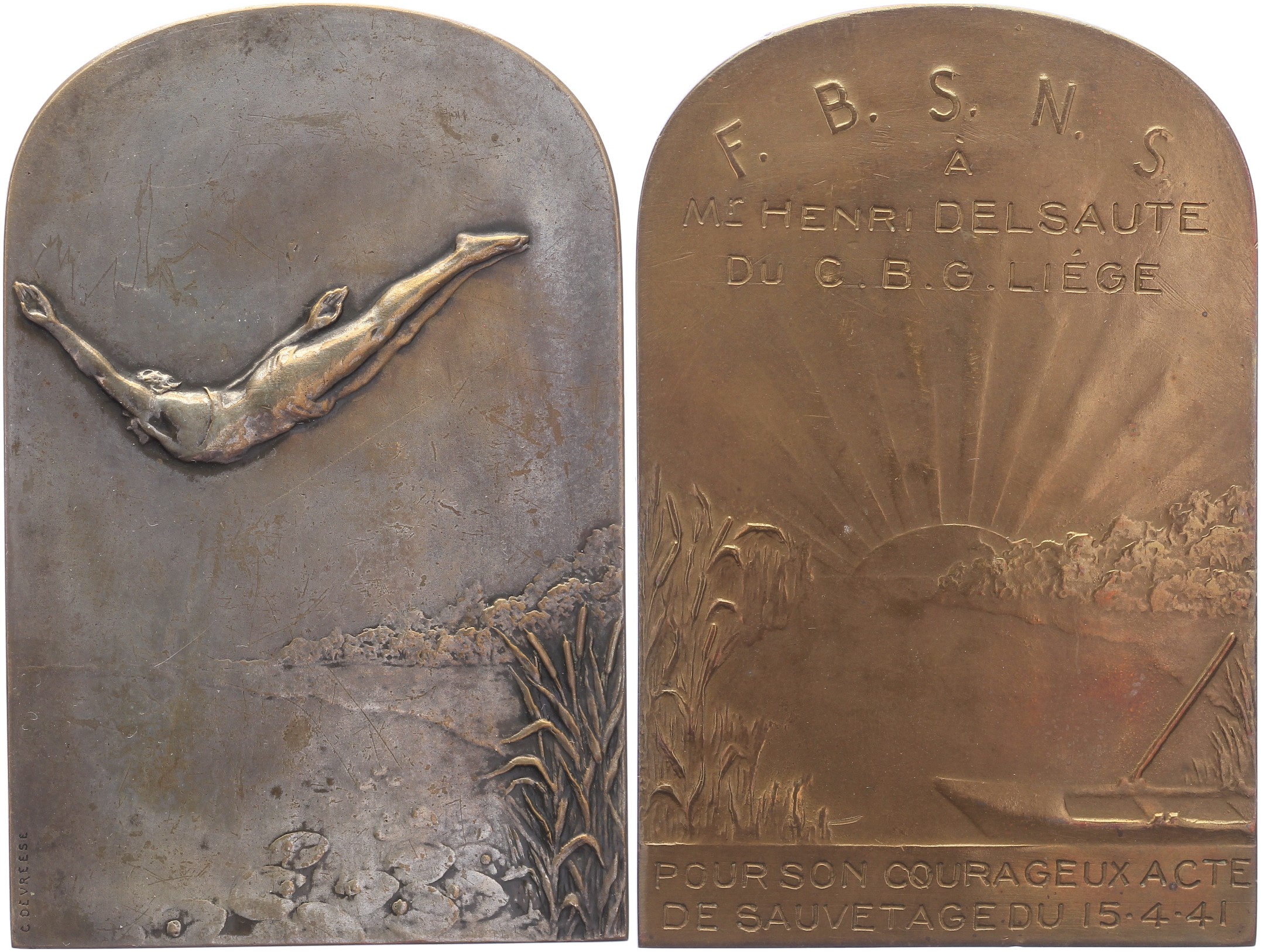 Lot (2) (1920)/1941 Prijspenning FBSNS/FRBNS “De Duiksprong”. Duikende zwemmer. / Diverse keerzijdes (1 x “EPREUVE D’AUTEUR”).  Æ + Æ verzilverd 76 x 50 met gebogen bovenkant. Willenz 234; PVD 252. Zeer fraai.