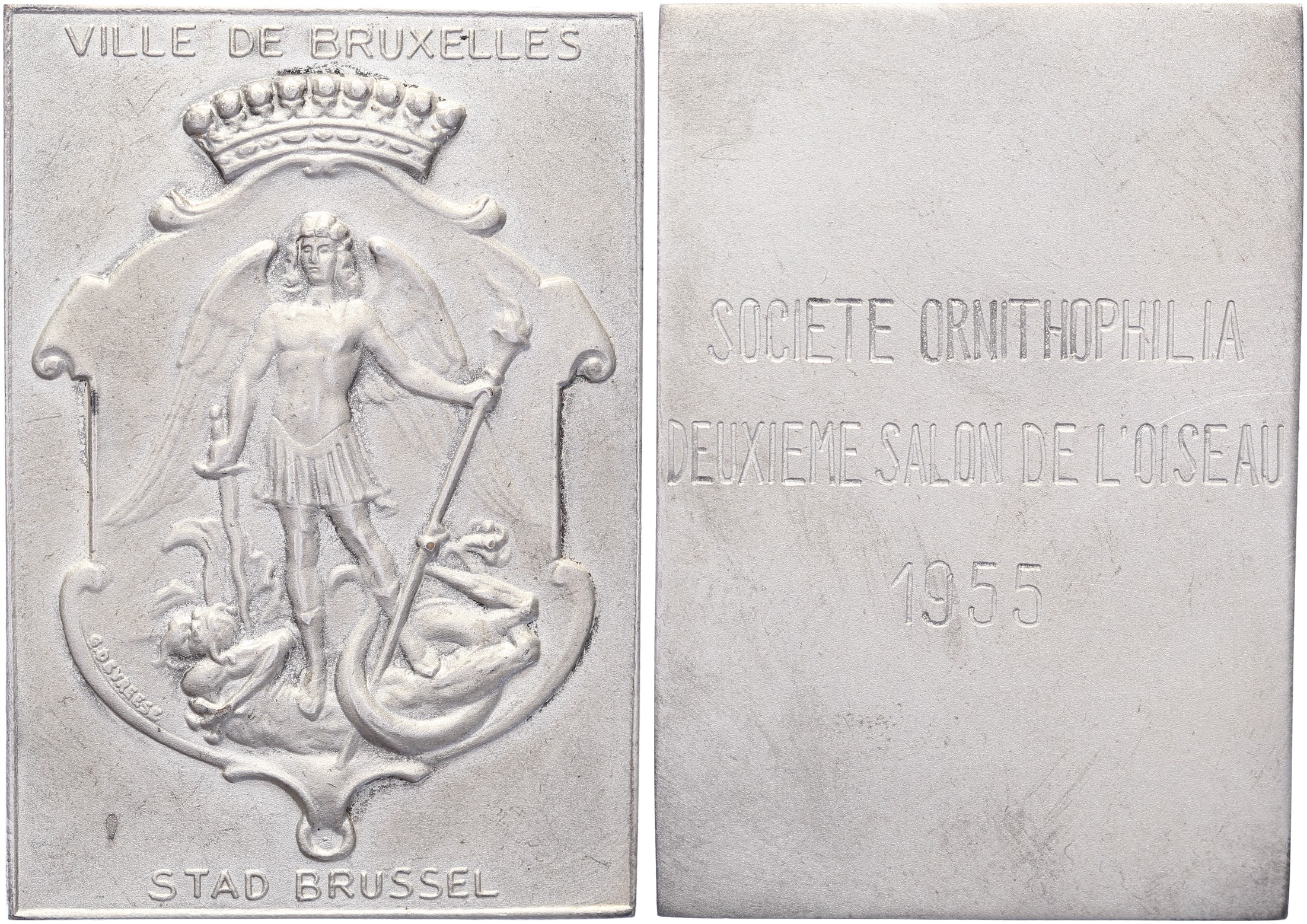(1921/1955) Ereplaquette stad Brussel. Wapen van Brussel (vz1). / Drieregelige inscriptie. Æ verzilverd 59 x 41,6. Willenz 236; PVD 254. Prachtig.