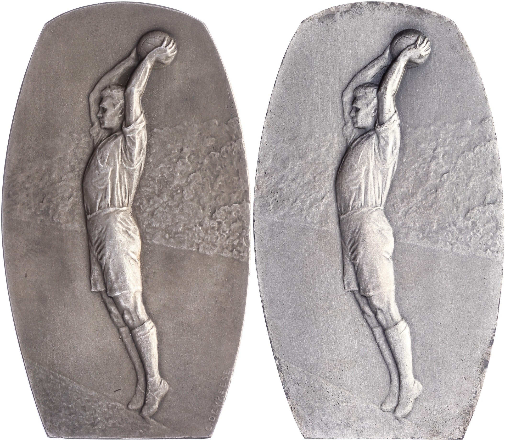 Lot (2) 1951, 1998 Prijspenning KBVB/URBSFA “De Ingooi”. Voetballer, aan de zijlijn, gooit in. / Diverse keerzijdes. Æ verzilverd 85,6 x 49. Willenz 243; PVD 261. Prachtig.