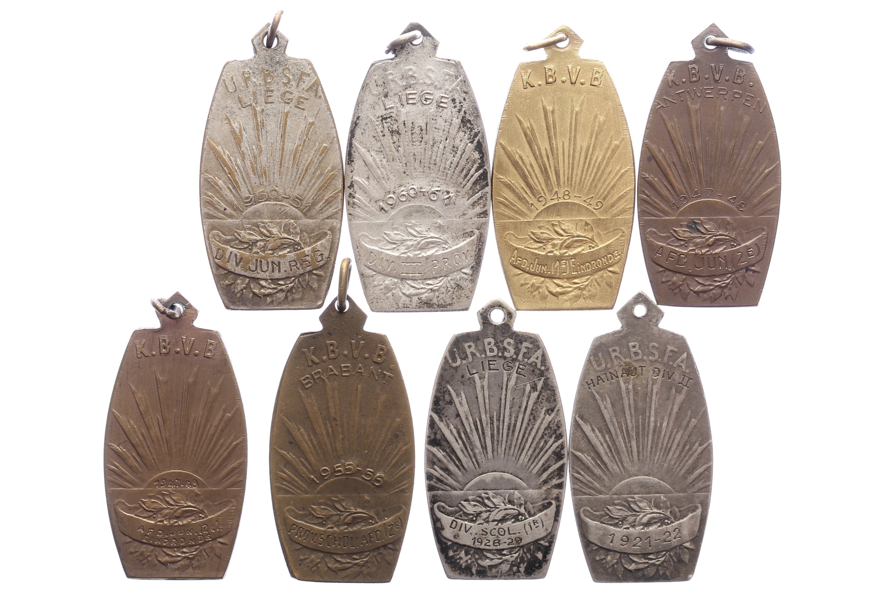 Lot (8) 1922-1961 Prijspenning KBVB/URBSFA “De Ingooi”. Voetballer, aan de zijlijn, gooit in. / Diverse keerzijdes. AR + Æ + Æ verzilverd 44 x 22. Willenz 243; PVD 261. Zeer fraai.