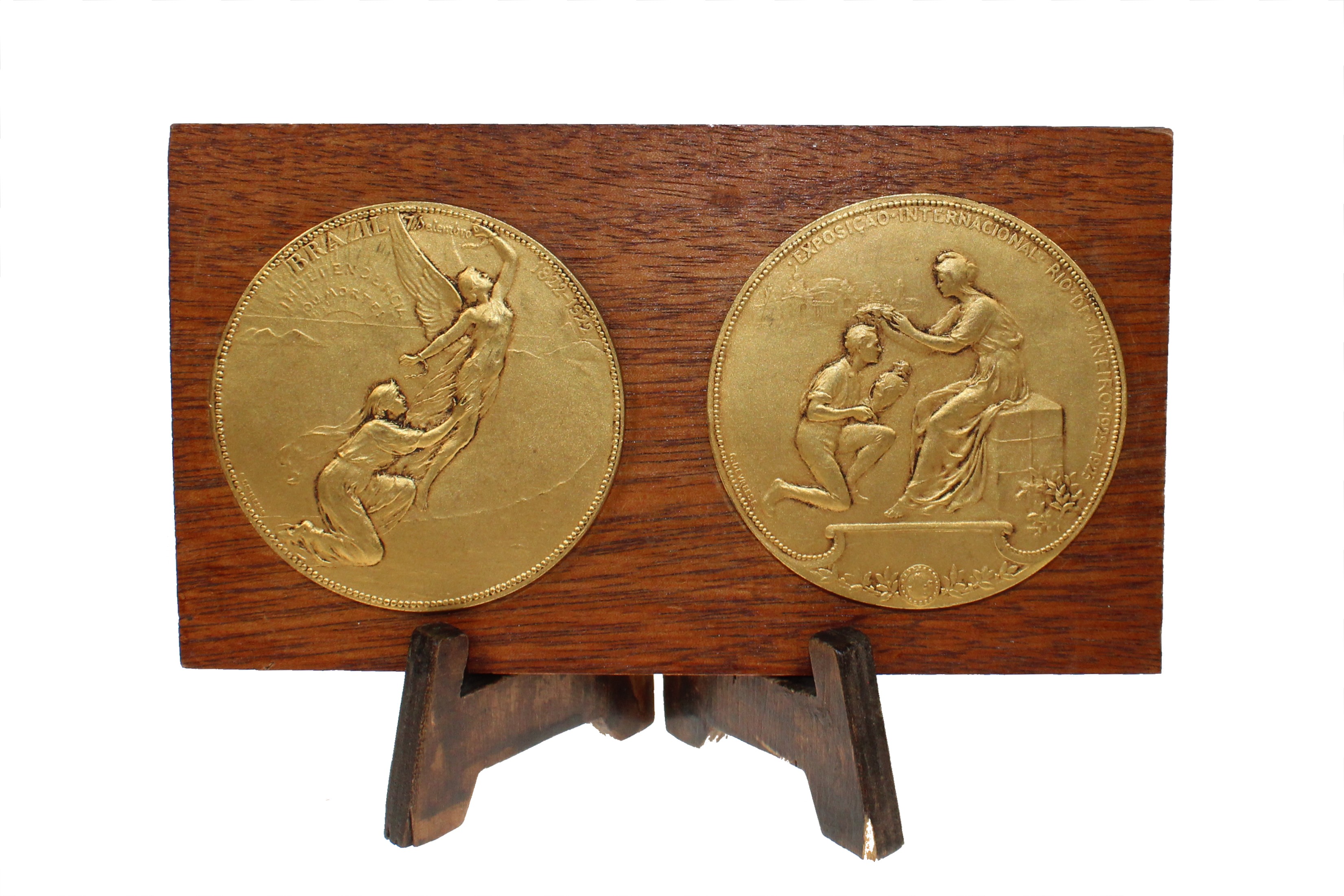 1922 Wereldtentoonstelling Rio de Janeiro. Zittende vrouw lauwert inzender. / Engel ontsnapt aan slavernij. Æ 74 verguld; twee helften gemonteerd op houten plankje. Willenz 248; PVD 266. Zfr.