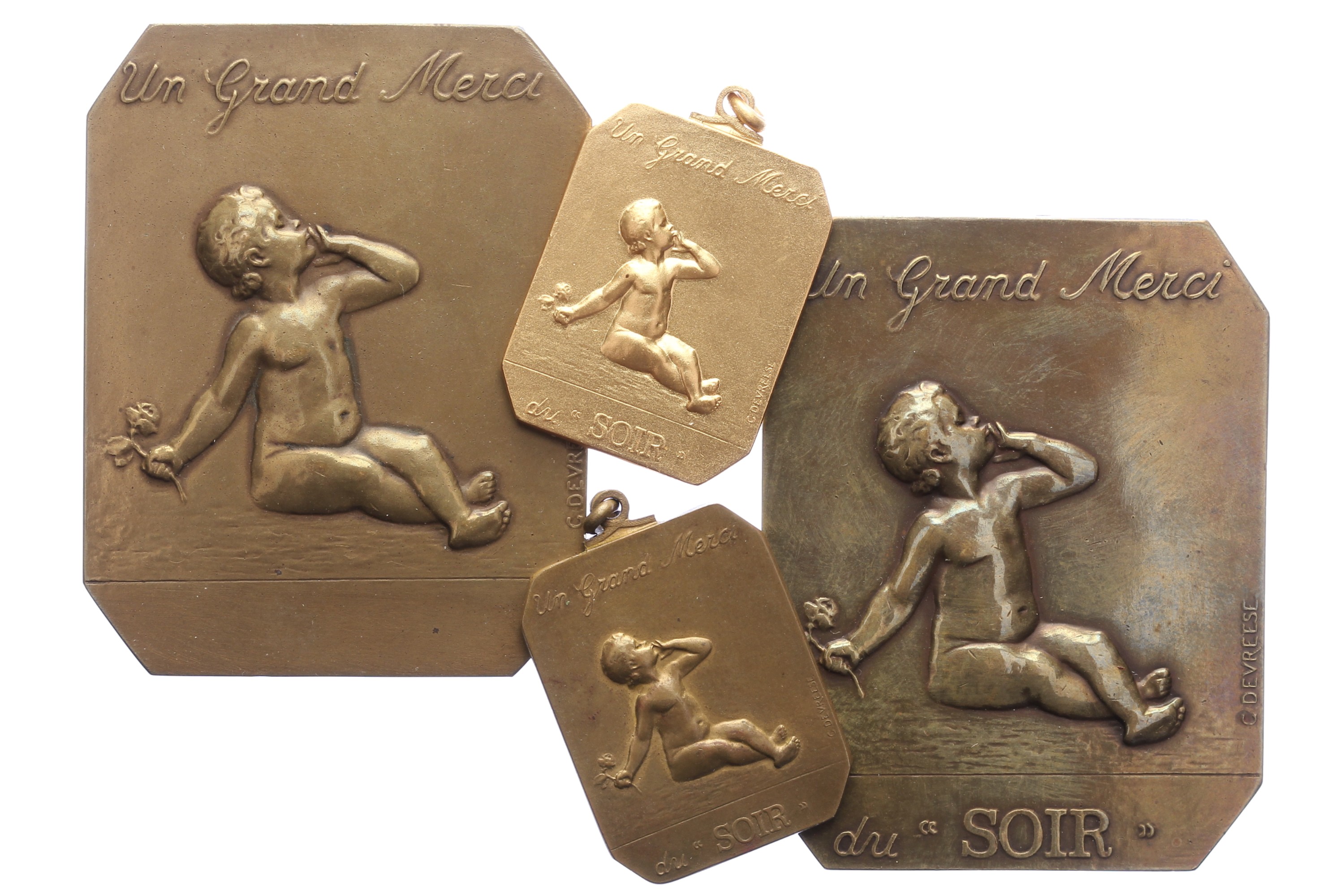 Lot (4) (1927) Un grand merci du Soir. Zittend naakt kind met roos. / Inscriptieruimte tussen bloemenranden. Æ 65 x 50 met afgeronde hoeken (2x); Æ + Æ verguld 34 x 26 met afgeronde hoeken (2x). Diverse varianten. Willenz 301; PVD 321. Prachtig.