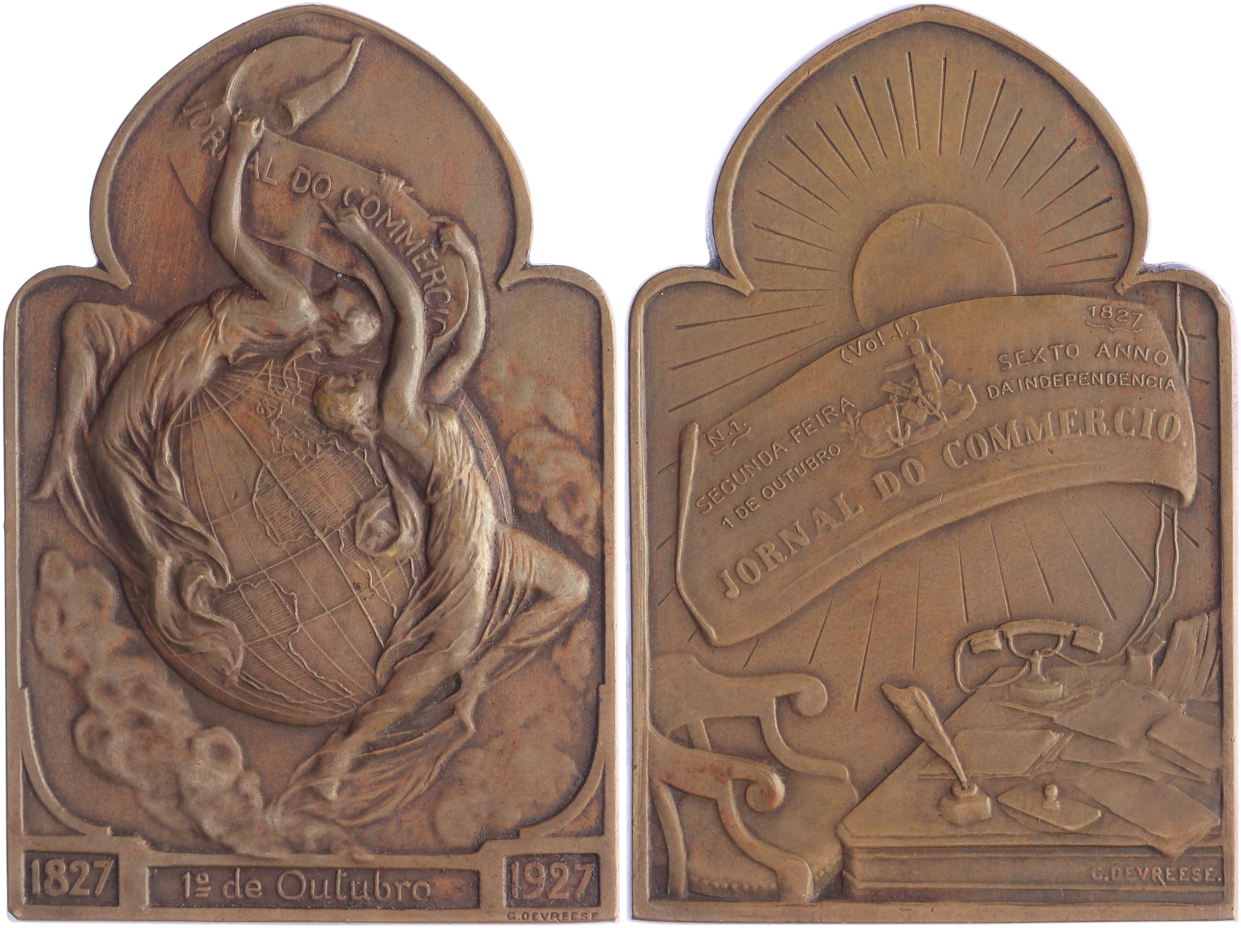 1927 Brazilië, Jornal de Commercio. Twee vrouwen rondom globe. / Redactiebureau. Æ 62,6 x 41,6 met bolachtige bovenkant. Willenz 303; PVD 323. Prachtig.
