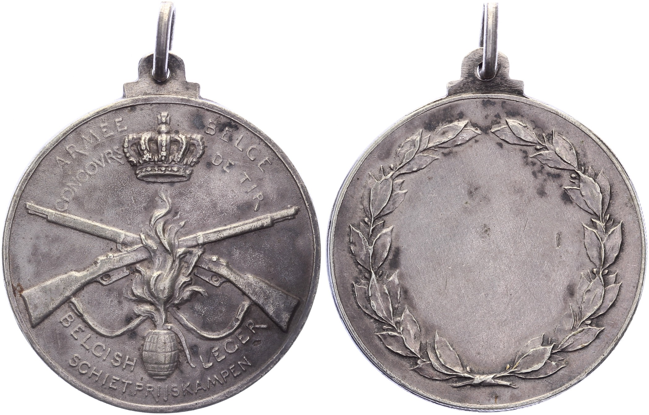 (1928) Schietprijskampen Belgish (sic) leger. Gekruiste geweren boven brandende granaat. / Inscriptieruimte binnen krans. Æ verzilverd met draagoog. Willenz 304; PVD 324. Zeer fraai.