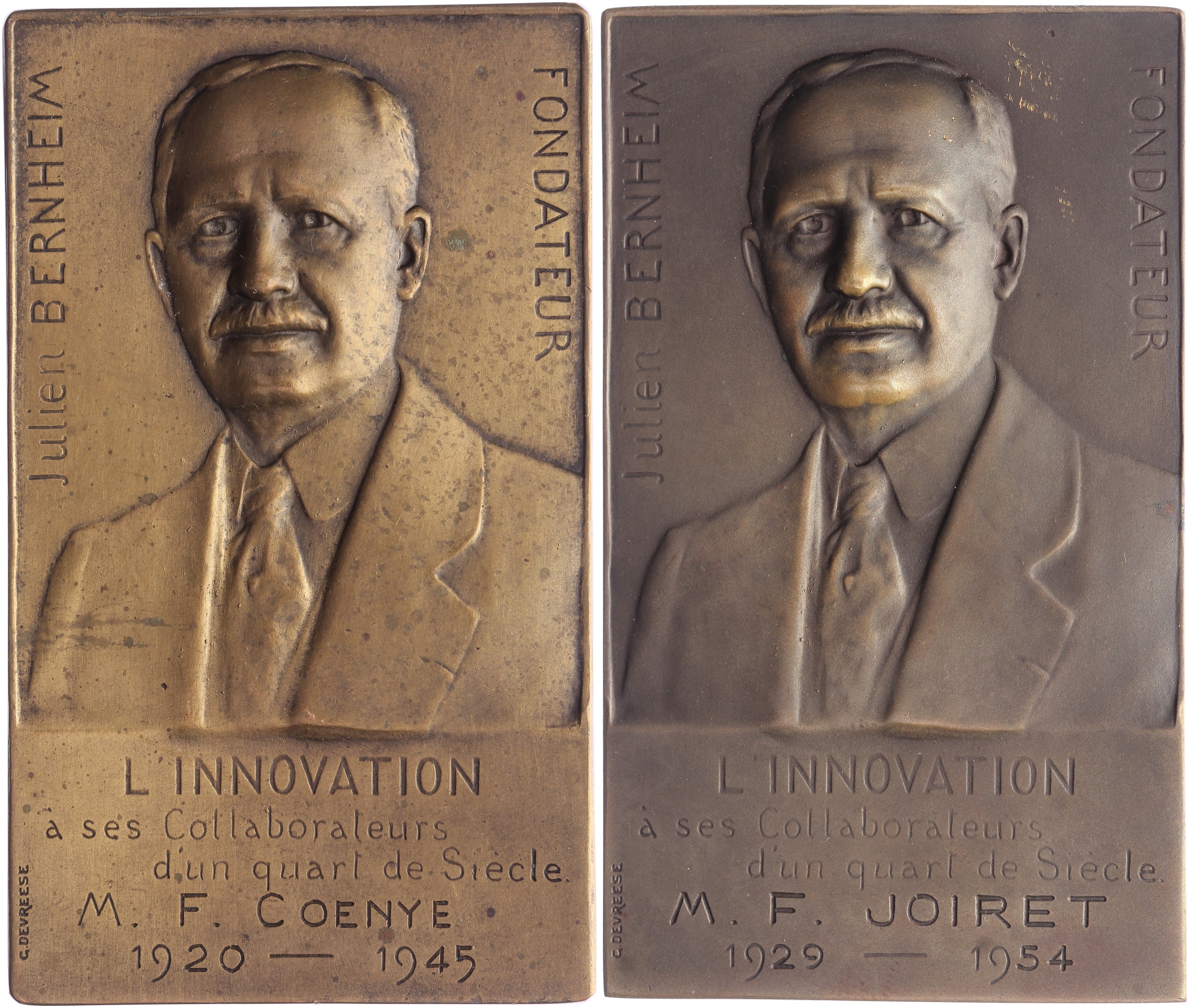 Lot (2) (1928) Julien Bernheim. Erepenning warenhuis “L’Innovation”. Buste en face. / Werkman met engel. O.n.v. M.F. Coene / M.F. Joiret. Æ 80,7 x 47,4. Willenz 306; PVD 326. Prachtig.