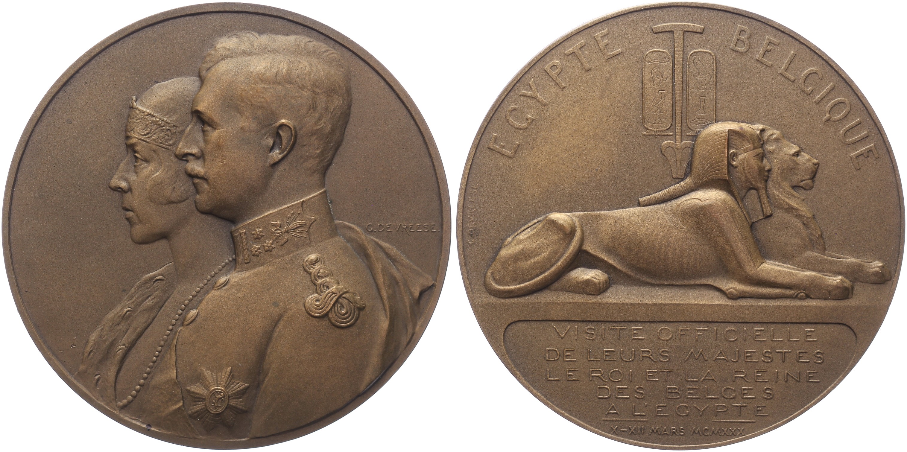 1927 Reis naar Egypte Albert I & Astrid. Dubbelportret naar links. / Liggende sphinx en leeuw. Æ 71,6. Willenz 310; PVD 330. Gepoetst. Prachtig.