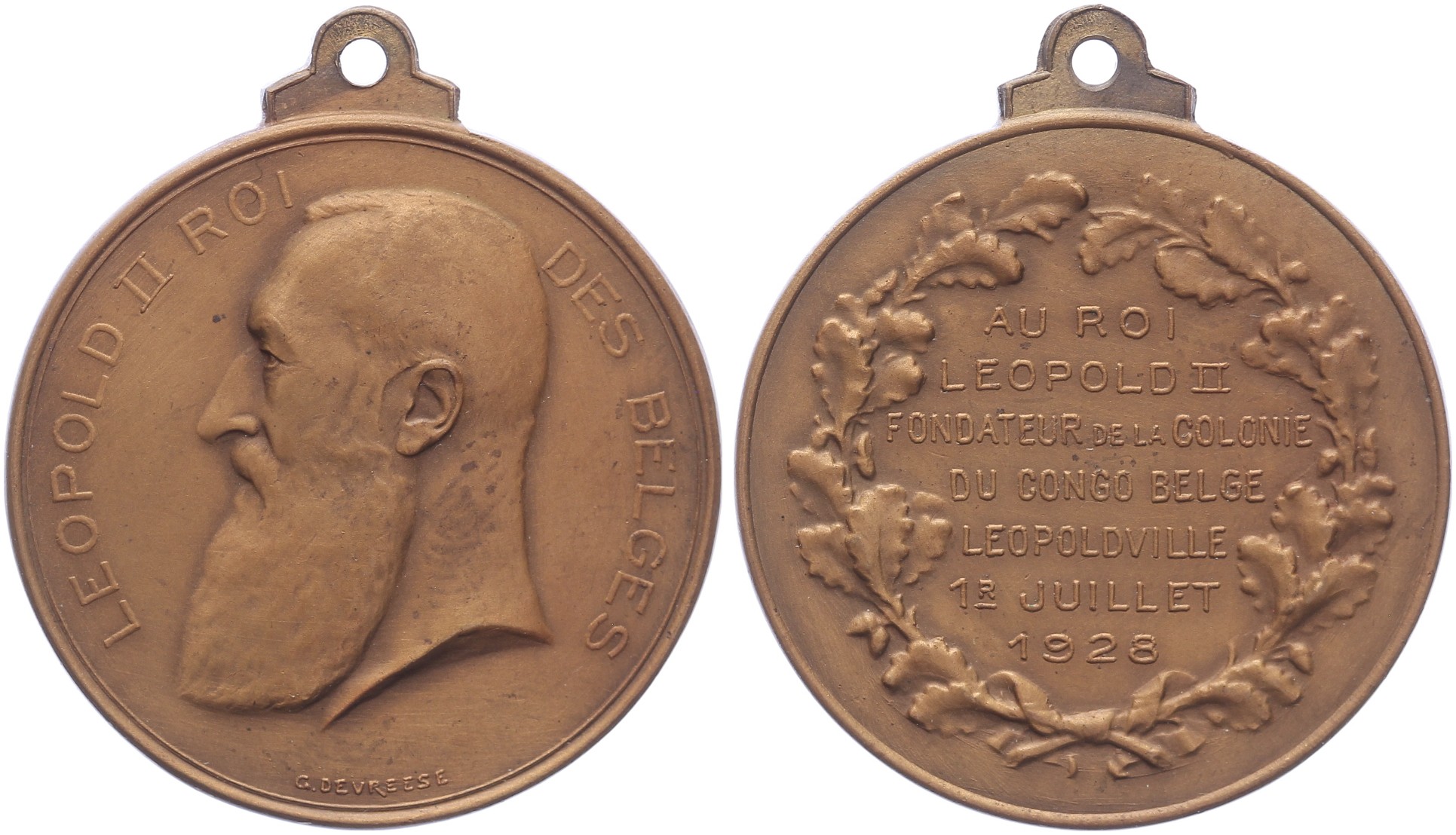 1928 Leopold II, stichter Belgisch Congo. Hoofd naar links. / Zevenregelig opschrift binnen krans van eikentakken. Æ 32,6 met draagoog. Willenz ―; PVD 333. Schaars. Prachtig.