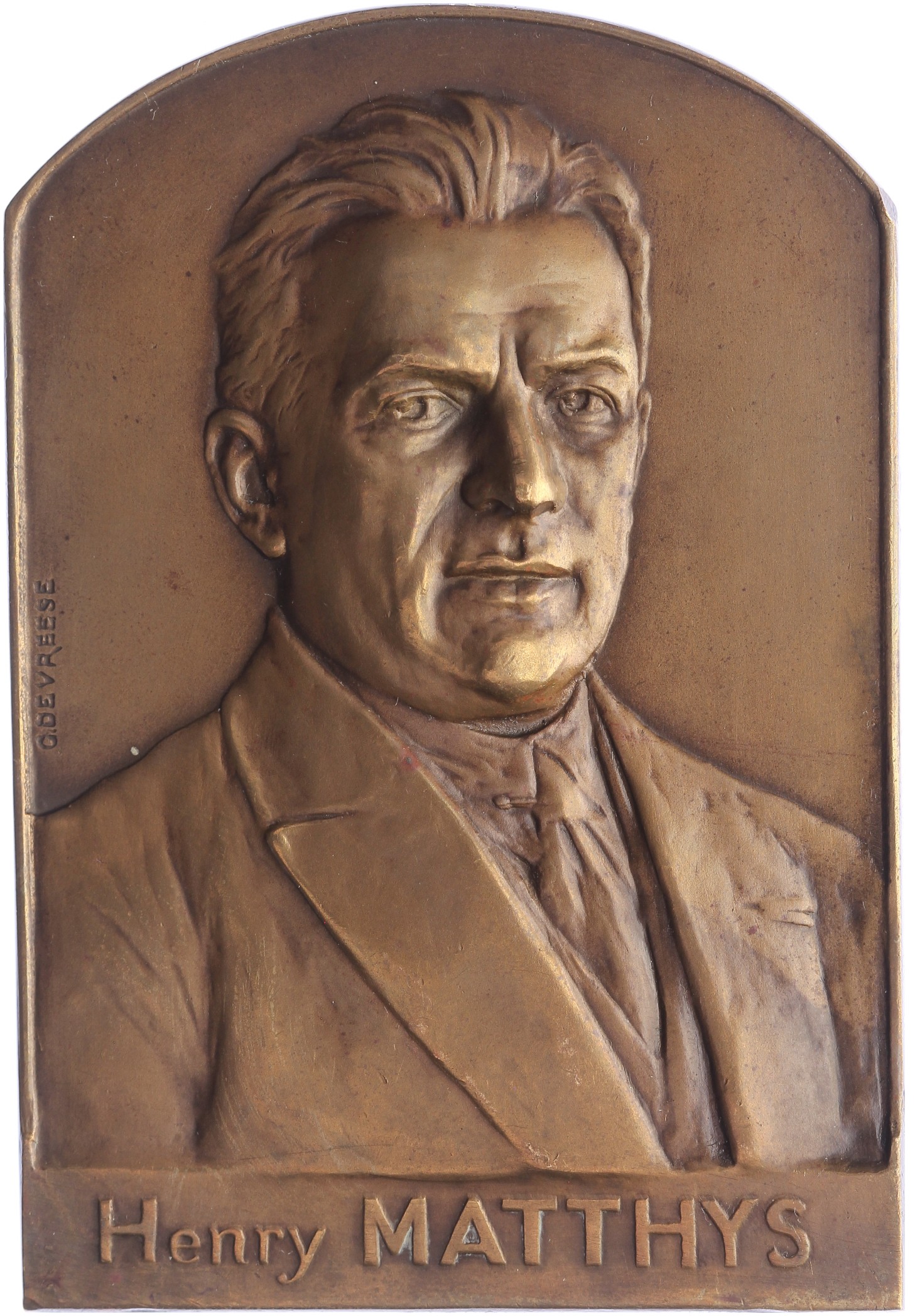 (1928) Ter ere van Henry Mattys, schilder. Buste en face. / Blanco. Æ 71 x 48,8 met gebogen bovenkant. Willenz 313; PVD 334. Prachtig.