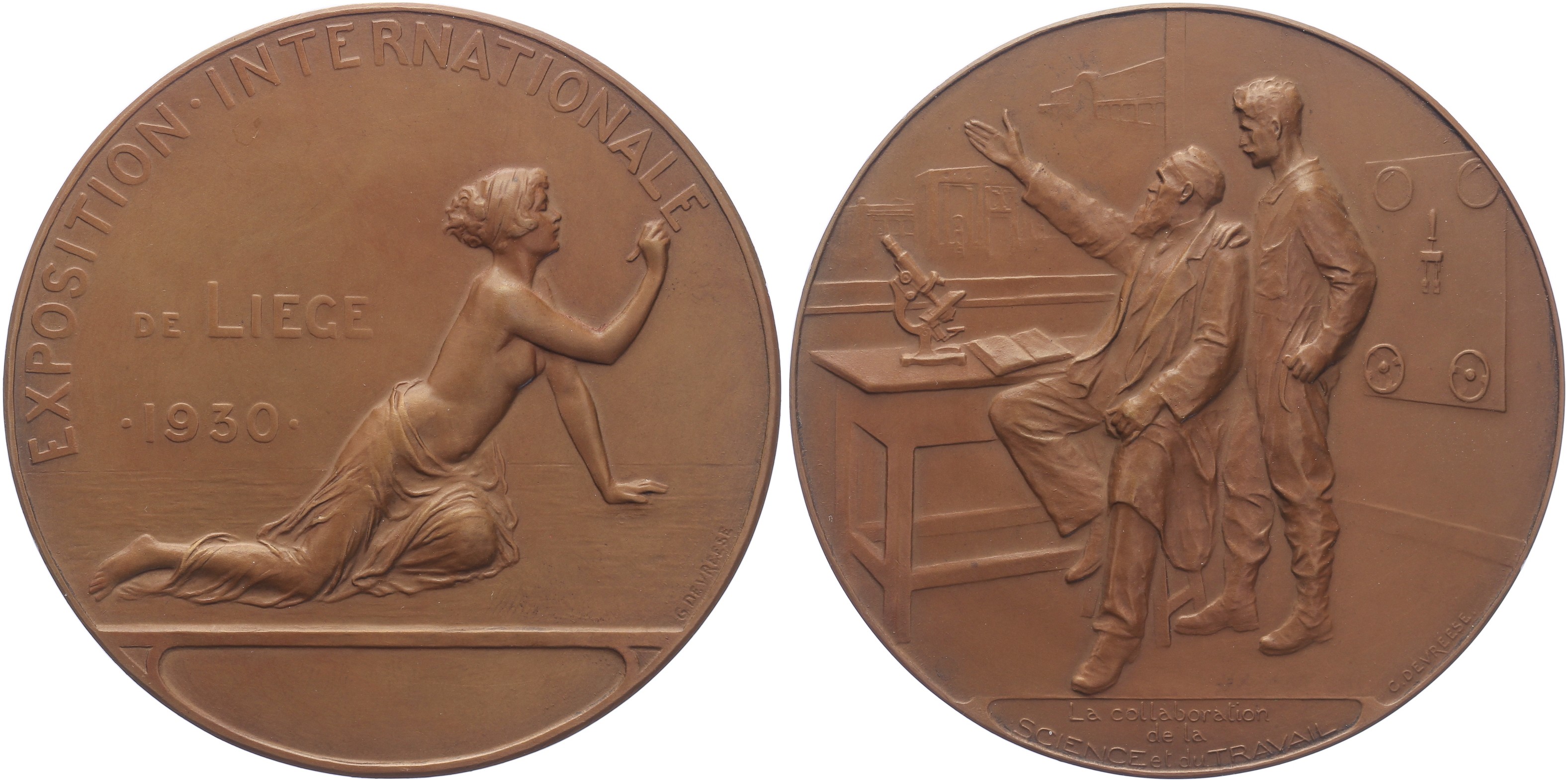1930 Wereldtentoonstelling Luik. Liggende halfnaakte vrouw. / Jonge en oude arbeider. Æ 70,2. Willenz 328; PVD 348. Prachtig.