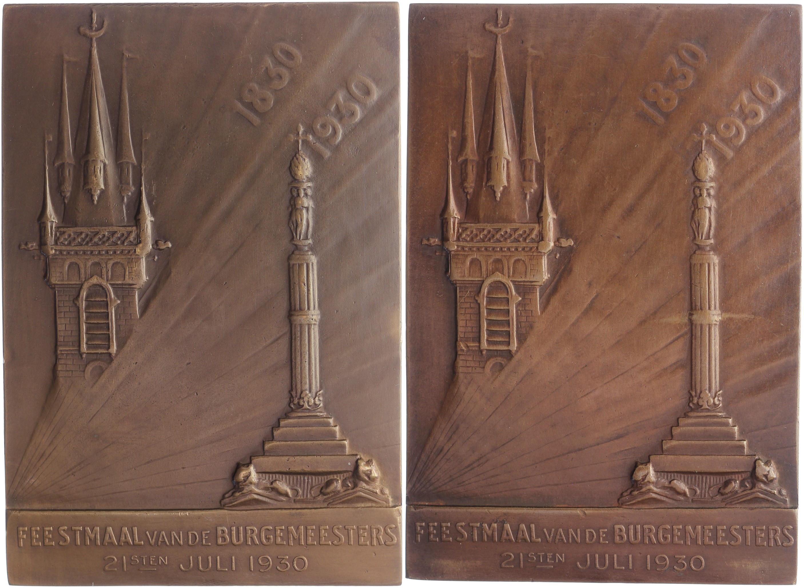 Lot (2) 1930 Feestmaal burgemeesters bij het eeuwfeest der onafhankelijkheid. Naakte buste Albert I naar links. / Toren Gentse Belfort en het Perron van Luik (kz1 – Vlaamse tekst). Æ 91,2 x 62,2. Willenz 336; PVD 355. Prachtig.