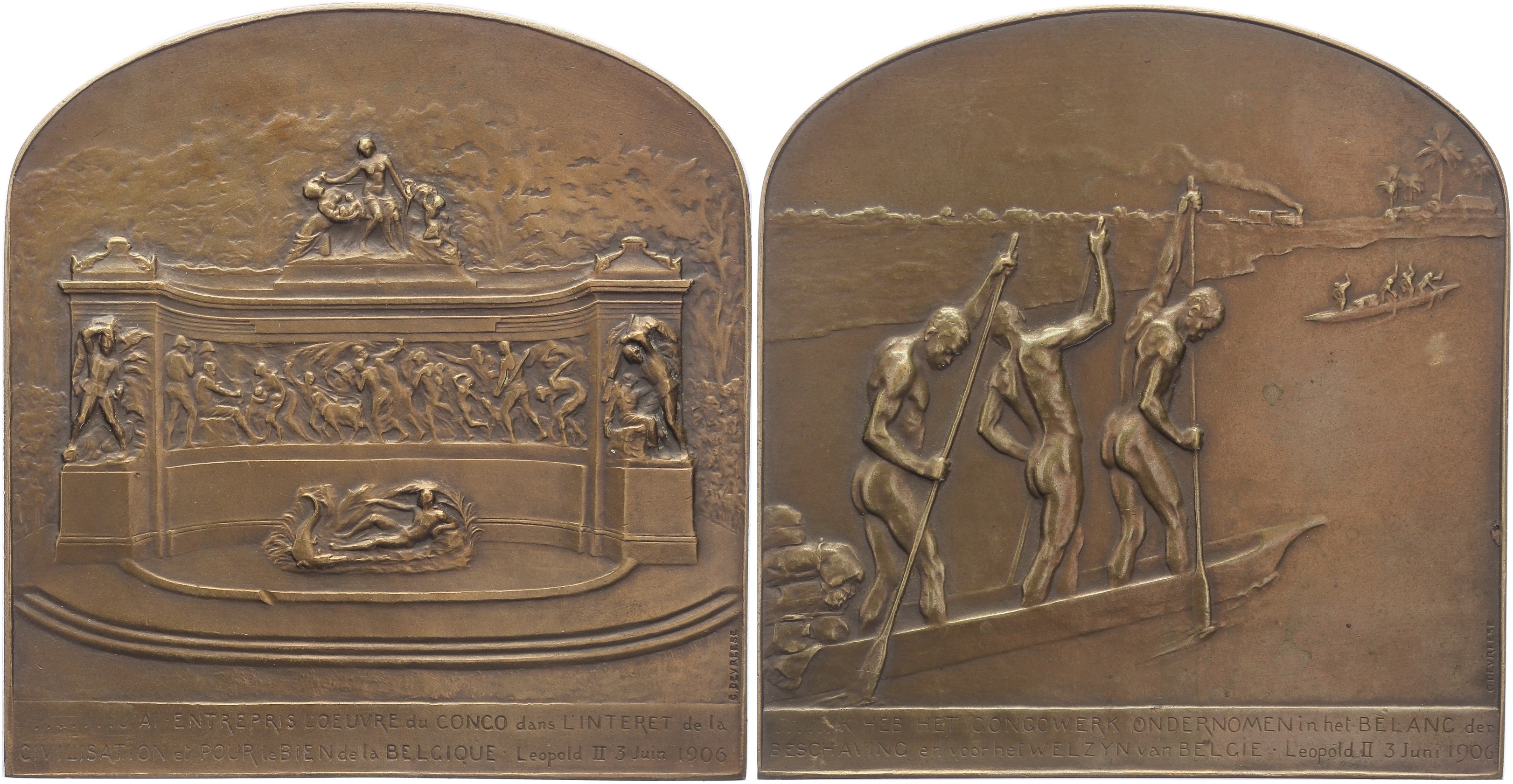 1930 Het gedenkteken van Congo. Monument in het Jubelpark. / Drie naakte mannen in houten kano vervoeren vracht. Æ 75 x 72,6 met gebogen bovenkant. Willenz 337; PVD 356. Prachtig.