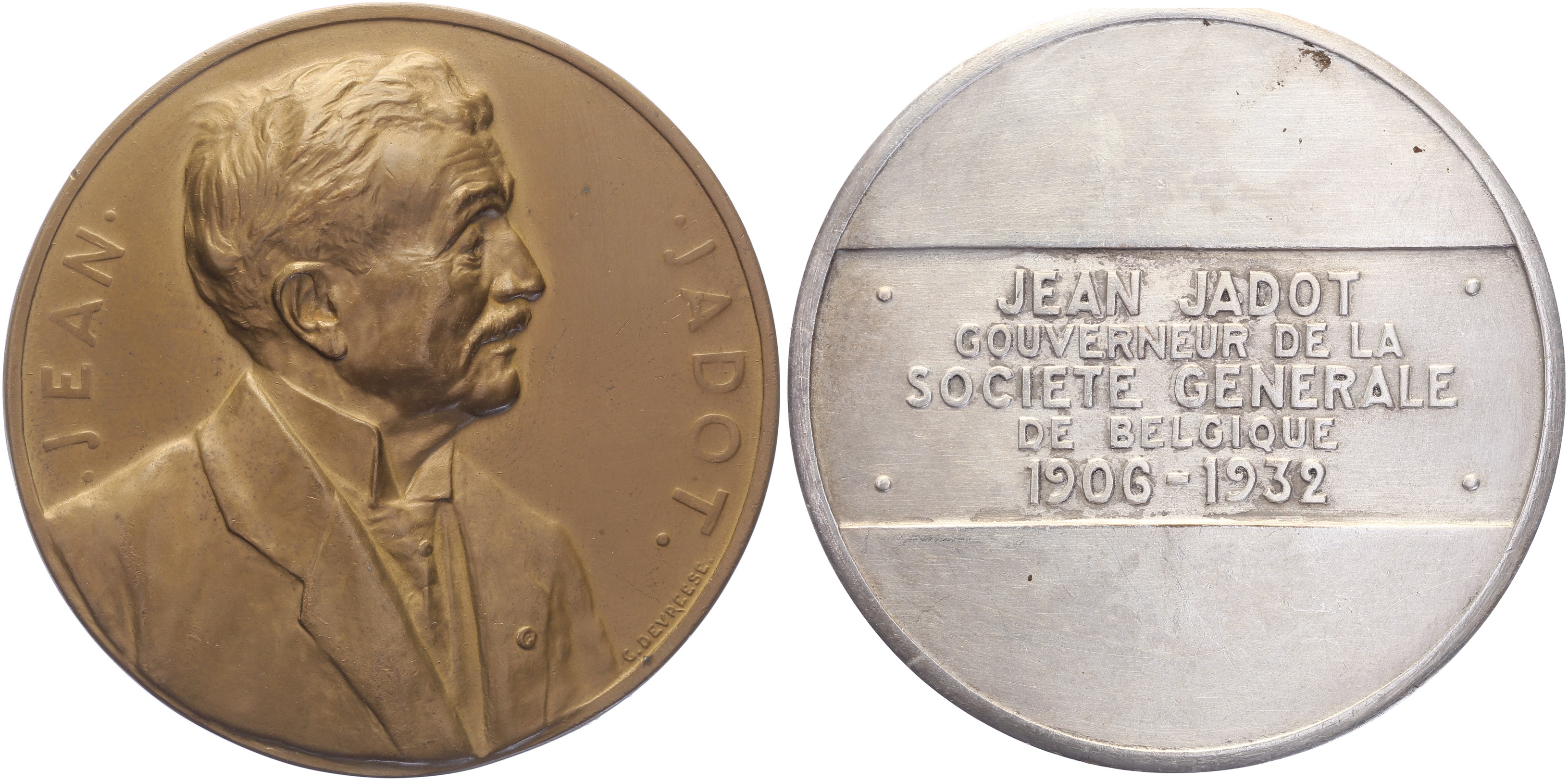 Lot (2) 1933 Ter ere van Jean Jadot, gouverneur “Generale Mij.”. Buste naar rechts. / Vijfregelig opschrift. Æ + Æ verzilverd 69,6. Willenz 361; PVD 379. Prachtig.