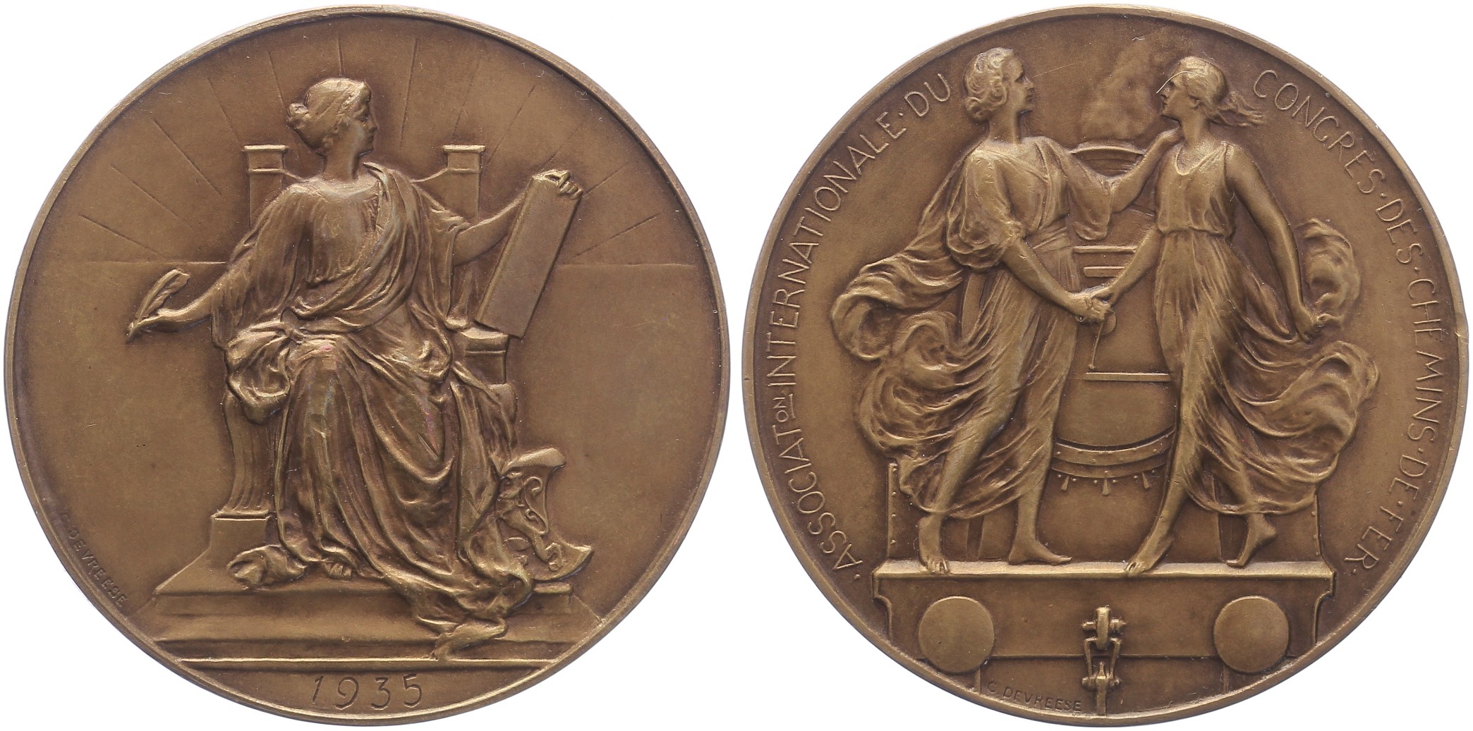 1935 Congres spoorwegen. Getroonde vrouw met register en ganzenveer. / Twee vrouwen, staand voor stoomloc, geven elkaar de hand. Æ 50,2. Willenz 377; PVD 399. Prachtig.