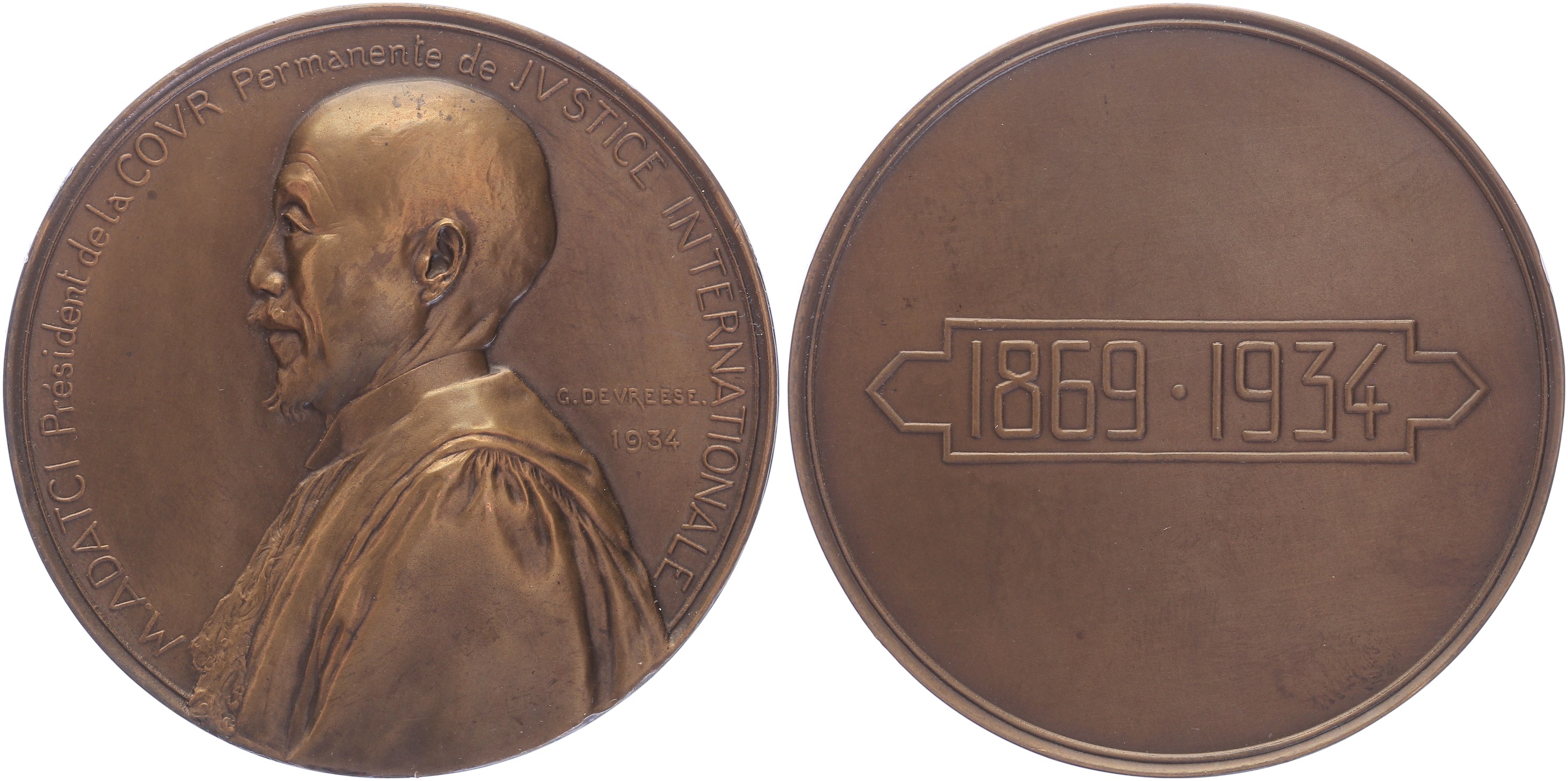 1934 M. Adatci, president Internationaal Gerechtshof. Buste naar links. / In kader de jaartallen 1969-1934. Æ 70,4. Willenz 390; PVD 412. Prachtig.