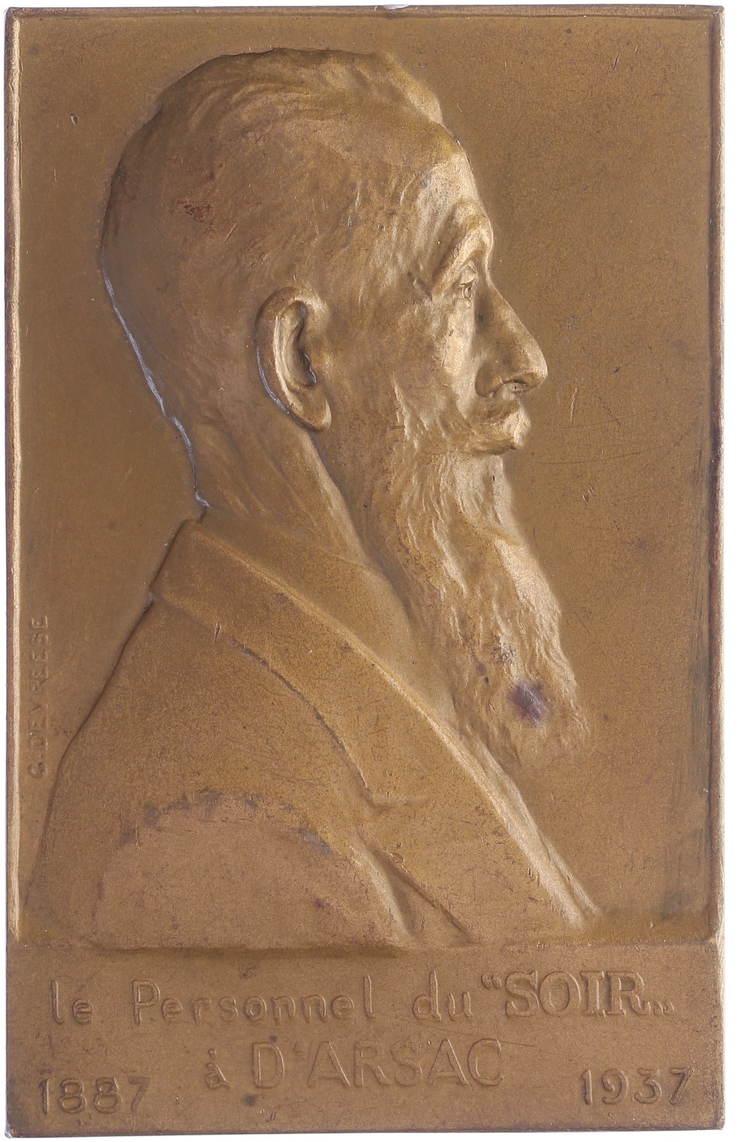 1937 Ter ere van d’Arsac, journalist. Buste naar rechts. / Blanco. Æ 78,6 x 50,3. Willenz 393; PVD 415. Vlekje. Prachtig.