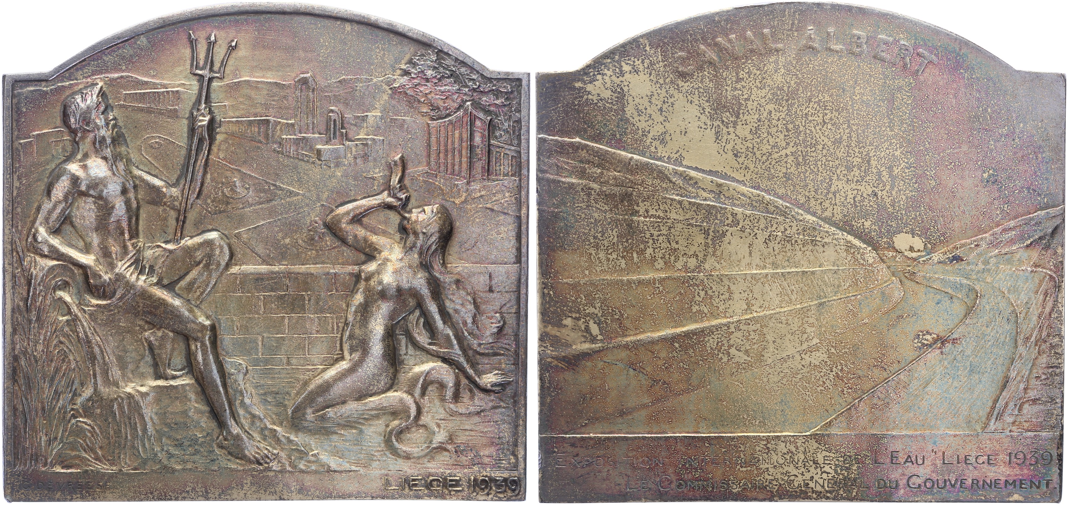 1939 Luik. Internationale watertentoonstelling. Zittende Neptunus bij knielende zeemeermin. / Zicht op het Albertkanaal. AR verguld [226 gr.] 81,8 x 77,8 met gebogen bovenkant. Willenz 404; PVD 431. Prachtig