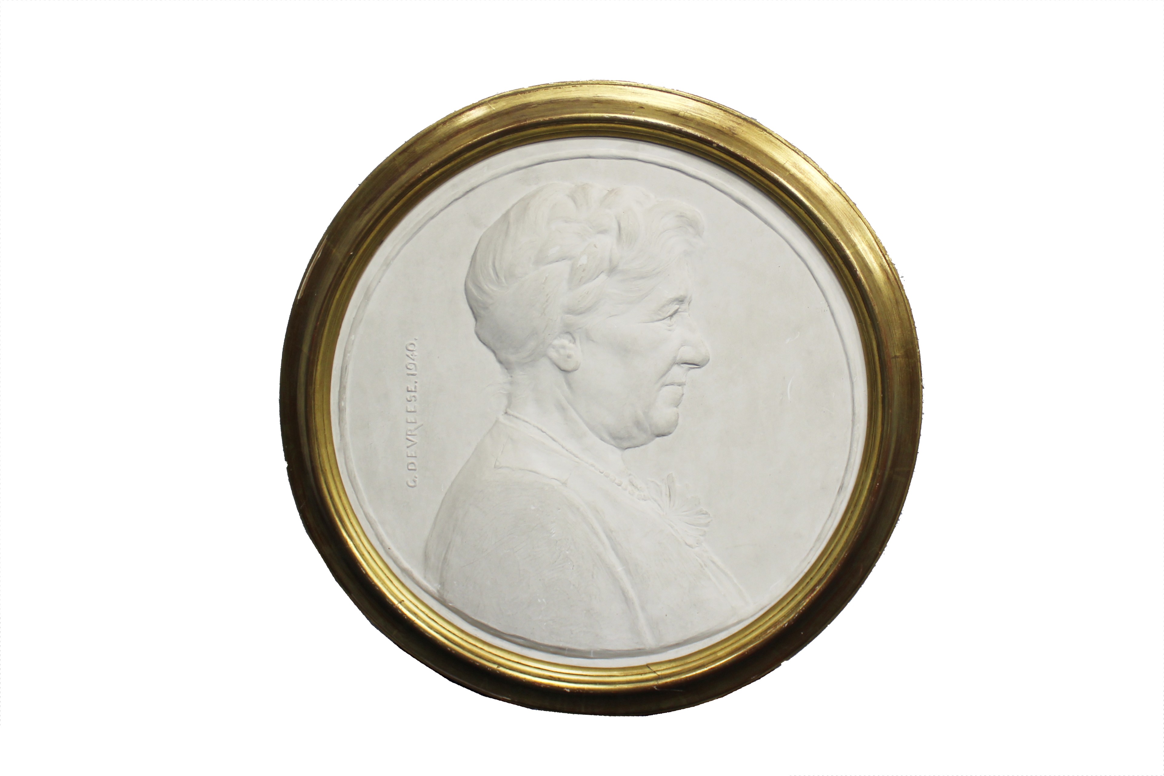 1940 Onbekende vrouw. Buste naar rechts. Gips 390. PVD 439. Ontwerp in gips, gemonteerd in verguld houten lijst [3,5 kg]. Prachtig.
