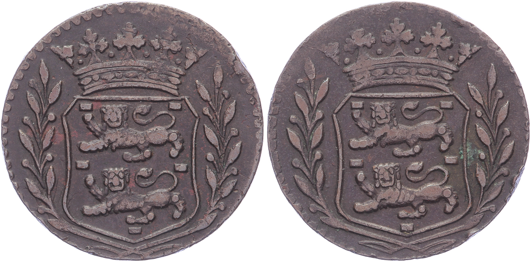 Duit z.j. Hybride, 2 x voorzijde. PW 3011.1; CNM 2.46.98; HPM 71.4. Zeer fraai.