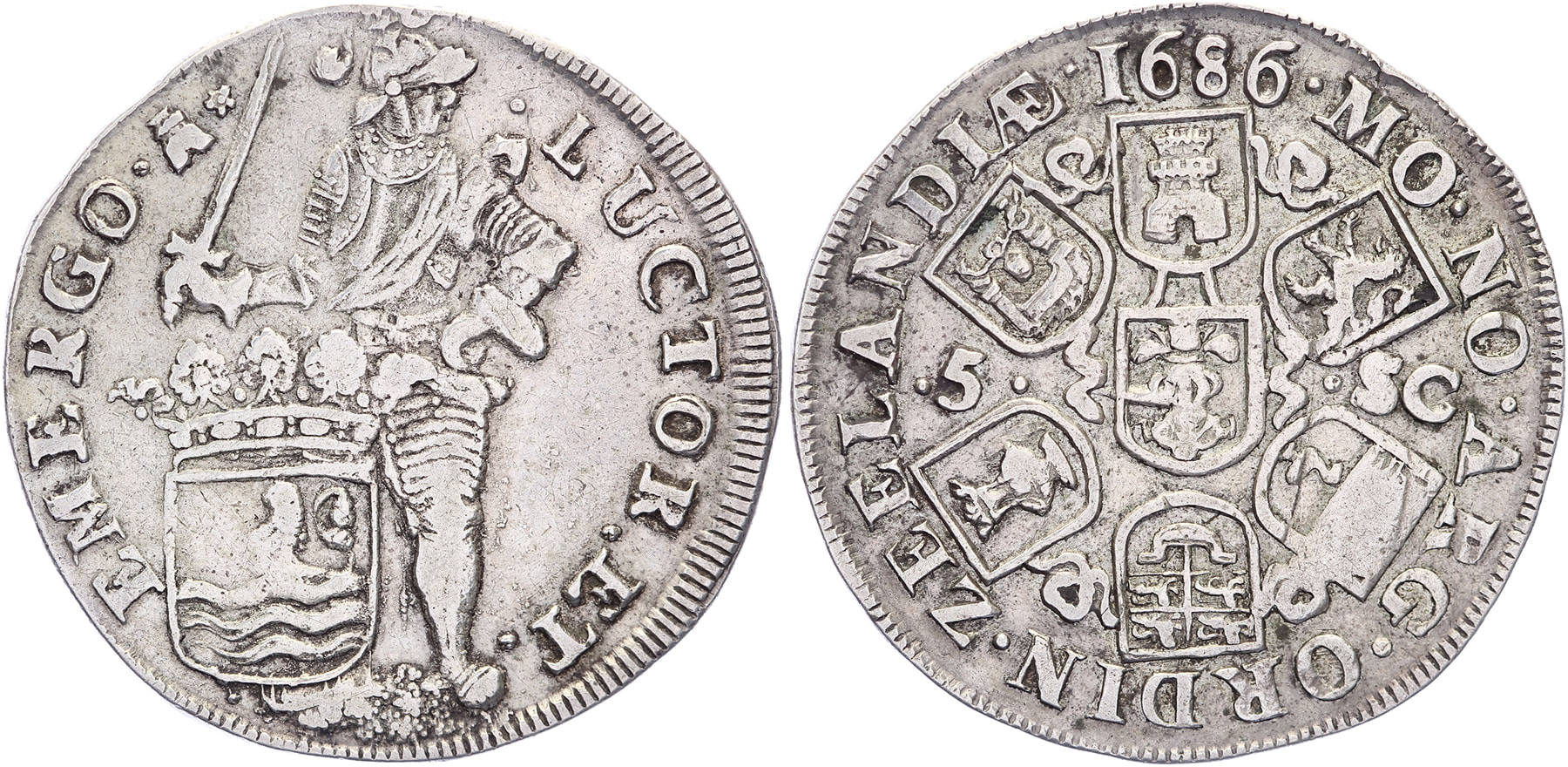 Daalder van 5 schelling 1686. Delm. 1085; CNM 2.49.68; HPM 60.Mooi rond exemplaar met alle omschriften duidelijk uitgemunt. Zeer fraai.