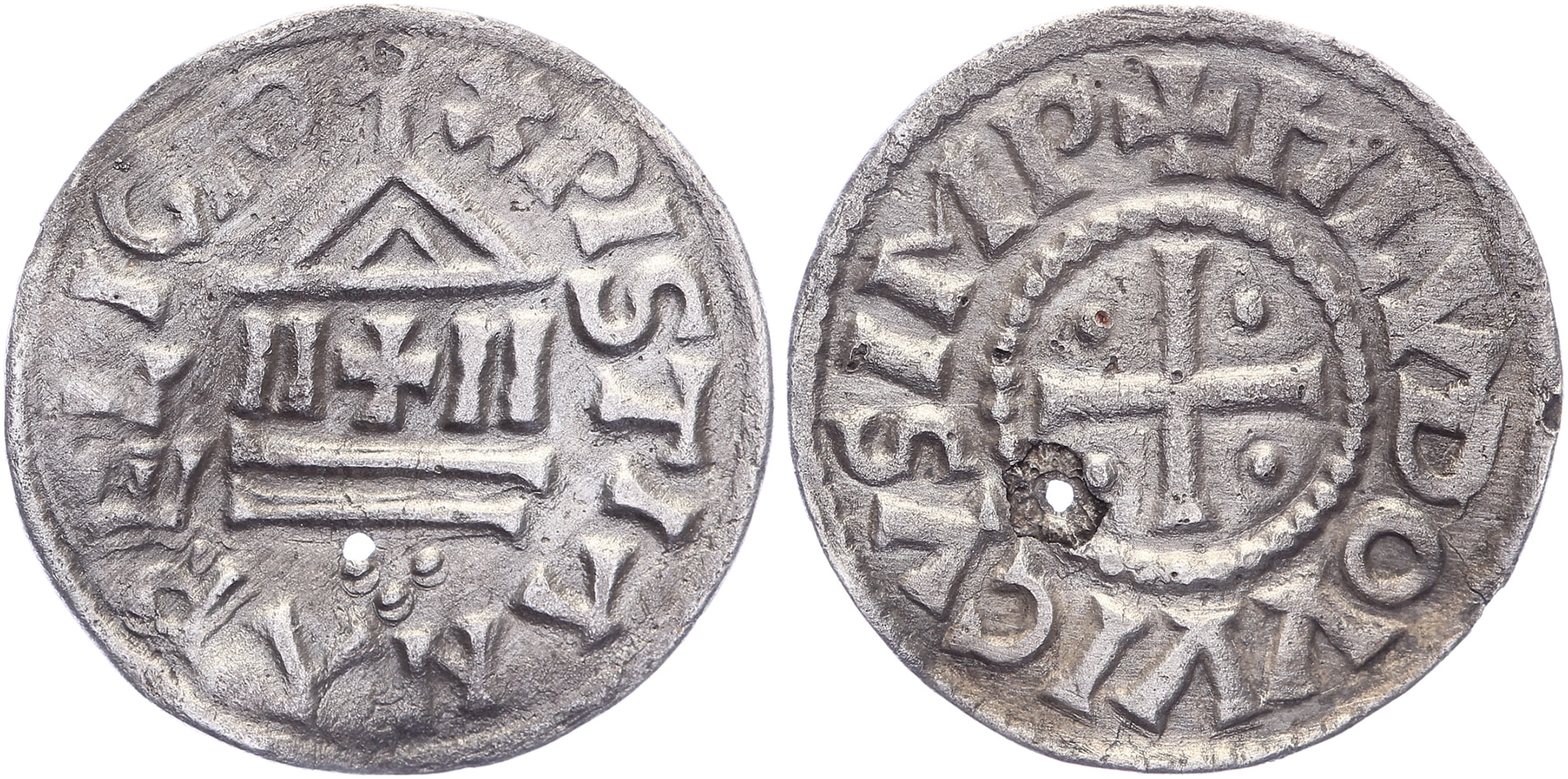 Denier z.j., type Christiana Religio met tempel en kruis. vdCh. XIII-10; JMP 1961, pag. 23. Gaatje in muntplaatje. Ruim zeer fraai.