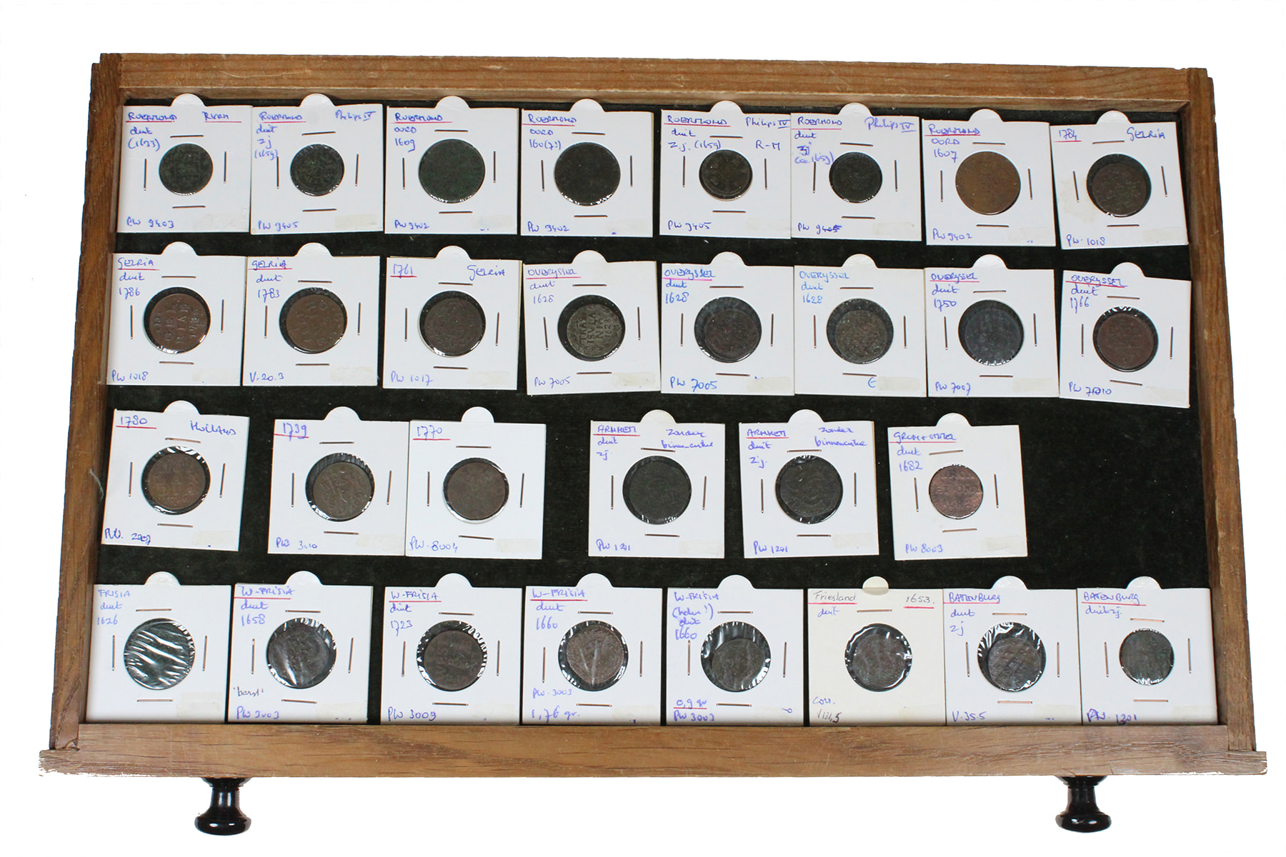 Doosje met 30 munten, voornamelijk duiten van o.a. Roermond, Batenburg, Arnhem en diverse provincies. Alle beschreven. Meeste in matige kwaliteit.
