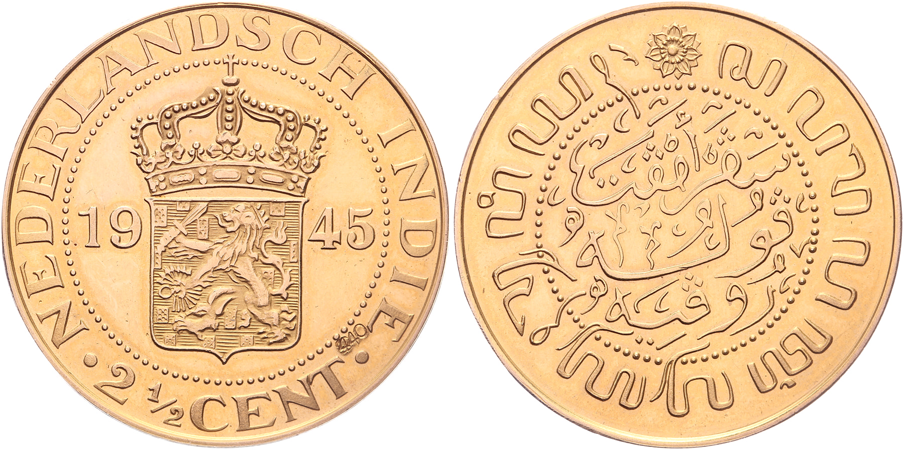 2 ½ Cent 1945, afslag in goud van 13 gram. Restrike. Scholten. 932. Geslagen met gepolijste stempels. Met ingeslagen nummer 440 op voorzijde. Prachtig.