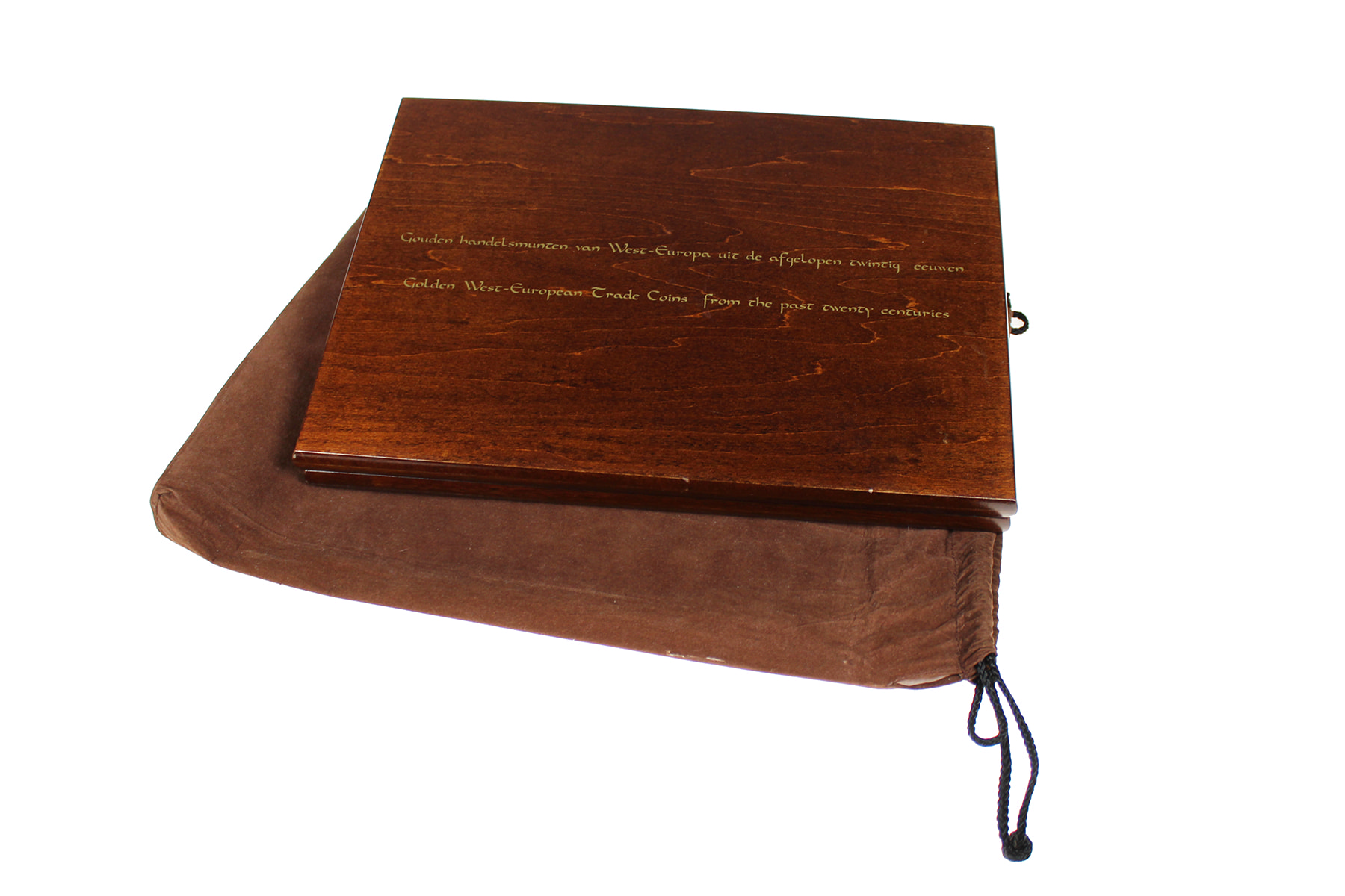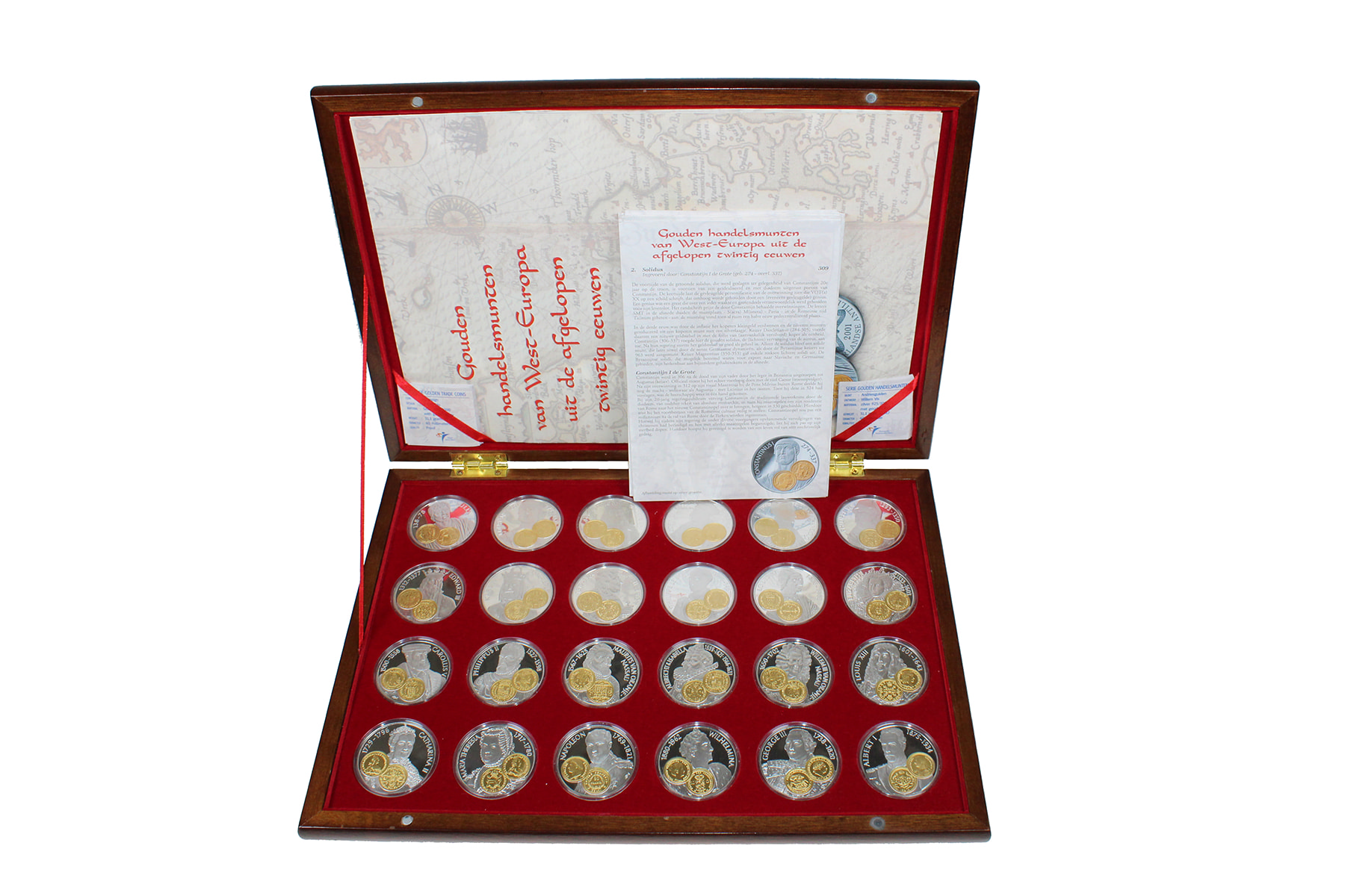 Lot (24) 10 Gulden 2001 handelsmunten van West-Europa uit de afgelopen twintig eeuwen. Complete serie van alle 24 verschillende 10 gulden handelsmunten in cassette. AR 925/1000 - 31,1 gram met gouden inlay van 0,62 gram.